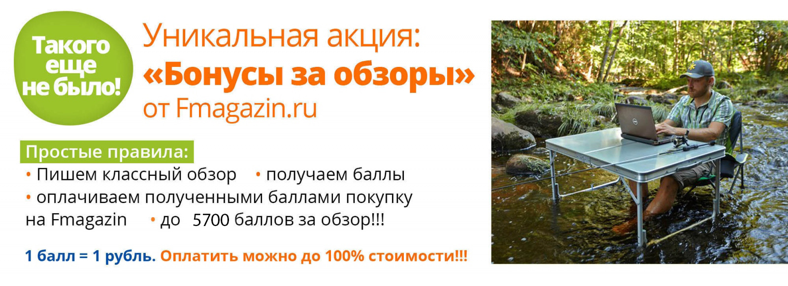 Все просто! Вы пишете хороший обзор о товаре, который есть в нашем интернет-магазине и участвует в акции*, размещаете его на Fmagazin (обзор должен быть уникальным, т.е. ранее нигде не размещенным) и получаете за это до 5 700 баллов (рублей)!!!, которые потом можно потратить, оплачивая покупки. Обзор не должен быть нигде пере опубликован ни до, ни после размещения на fmagazin (за исключением обзоров на снасти с оф. представителем которого Fmagazin заключил договор информационной поддержки, актуальный список тут→) . Участвуя в акции, вы автоматически передаете все права на дальнейшее использование вашего материала Fmagazin.