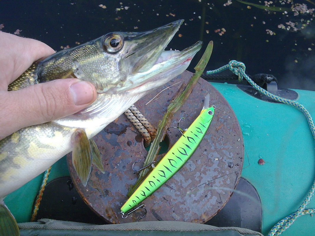 Расскажу историю одной рыбалки. Приехав на реку ближе к вечеру накачал лодку и выплыл в небольшой затон. Вода была очень прозрачная, даже на 5-ти метровой глубине можно было рассмотреть водоросли (такая особенность реки – джигом не половишь). К этой рыбалке я уже активно ловил на Рудру, поэтому и начал облов именно с ней. Сначала пробивать стал прибрежную зону камыша и зубатая не заставила себя долго ждать - с третьего заброса уже вытаскивал первого шнурка грамм на 400. Постепенно продвигаясь вдоль камыша выловил ещё пару шнурков минут за 30 (все отпущены) и небольших окуней. В принципе удовольствие уже получено, ведь случаются рыбалки и в «ноль». Спустя какое-то время решаю пробить центр затона, а там глубина метров до пяти, трава на дне. Сделав только два удара после заглубления приманки чувствую на паузе легкий «тук» - подсекаю – чувствую что рыба, но поначалу думал, что опять шнурок, так как щука пошла в мою сторону. Лишь уже возле лодки я понял - это мой новый рекорд! Трепет в руках - дрожь в коленях и щука в лодке у меня. Адреналин зашкаливает. Плыву к берегу и взвешиваю красавицу – 4кг. Щука настолько жадно схватила RUDRу, что хвостовой тройник пролетел сквозь жабру, а от 20-ти сантиметрового поводка из пасти торчал лишь краешек:
