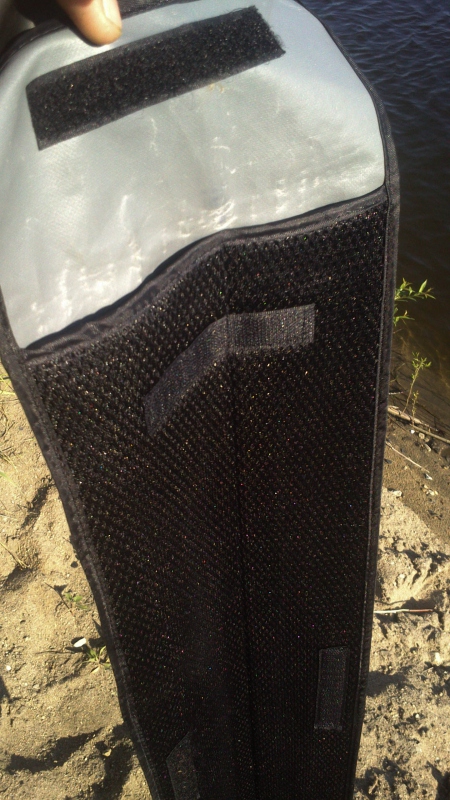 Чехол разделен на две секции и не совсем обычный. Снаружи он выполнен из прочного, плотного материала а внутри расположилась сетка с поролоном. Чехол конечно не стандартный и смотрится очень круто. Но это для виду, т.к на деле я не ощутил от этой сетки никакой пользы. Пробираясь по кустам я наткнулся этой самой сеткой на сухую ветку и порвал тот самый поролон, что спрятан под сеткой, в результате чего стали возникать трудности с извлечением спиннинга из чехла. При извлечении кольцо стало застревать в порванном поролоне. Иголка с ниткой все решили. Поэтому будьте аккуратны.