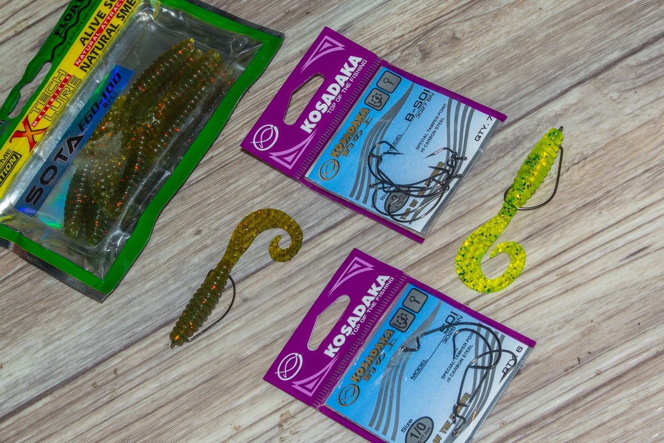 С этим силиконом нужно использовать тонкие офсетные крючки, такие как, например Kosadaka B-SOI размера №2, либо любой подобный. Потому что использование толстых тяжелых крючков, убивает полностью эффект плавучести в данной приманке.