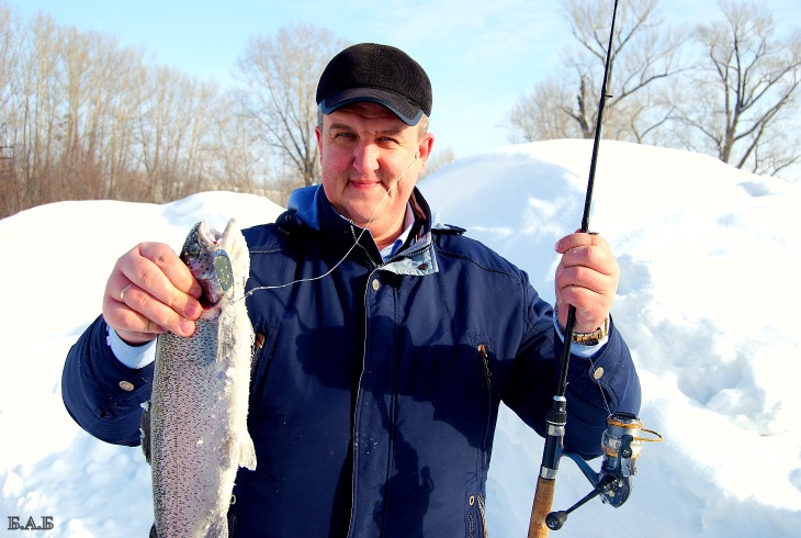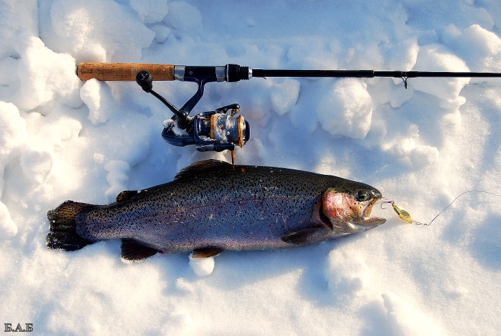 Пока добежал до машины, форель почти задубела, глаза ее стали стеклянными, а сама она перестала быть фотогеничной. Беру фотоаппарат с собой (а вдруг повезет еще раз?) и снова иду по лункам. Еще час безрезультатных поисков, перерыв на обогрев, снова блеснение, смена приманок, проводок, горизонтов ловли. Решаю не малодушничать, а доловить Косадакой до конца. Ближе к вечеру на трех соседних лунках получаю по поклевке в каждой на 5-сантиметровую серебристую Evo-RG. Меняю её на такую же, только в золотом цвете и 44-мм длине. Тут же получаю мощную, даже совсем не зимнюю поклевку, подсечка - ура, есть!