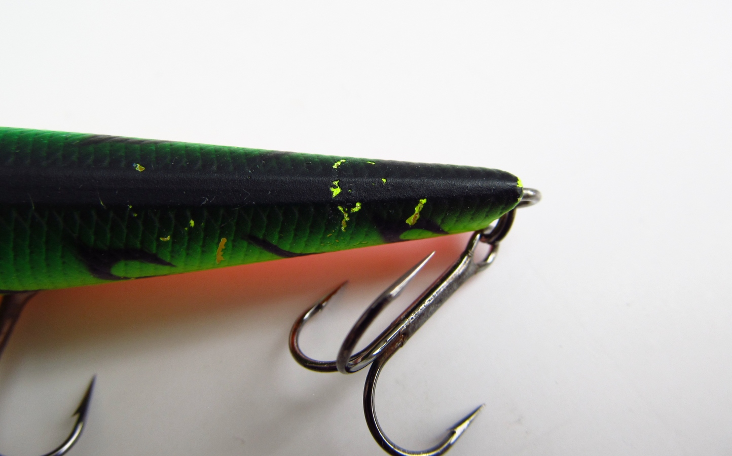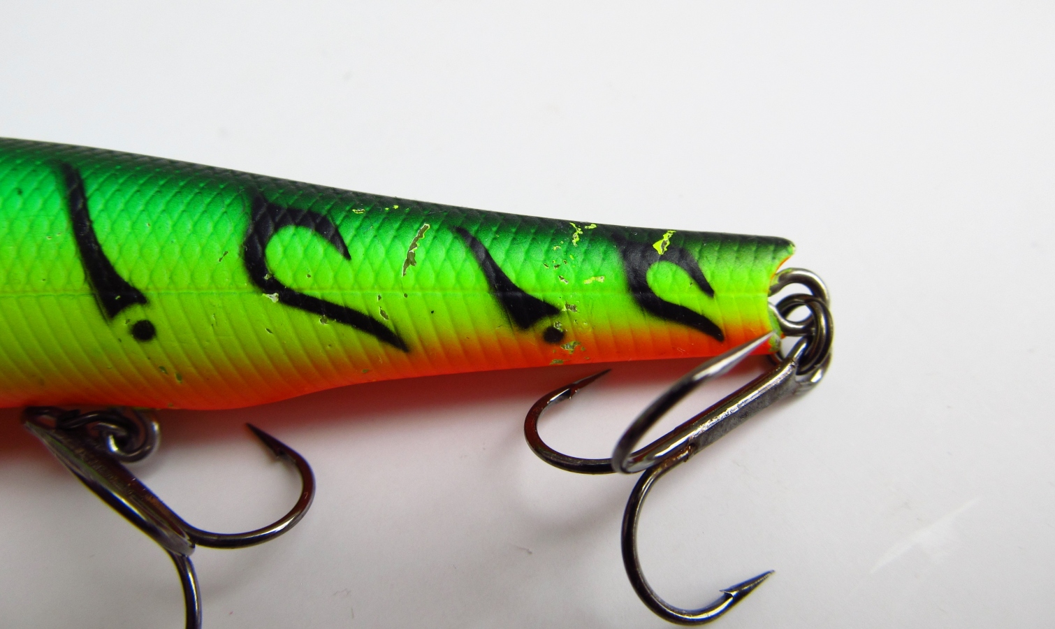 Покрытие воблера хоть и покрывается белыми точками после щучих укусов, но всё же является довольно-таки стойким для “мат тайгера” по сравнению с аналогичными покрытиями многих “одноклассников” и долгое время не теряет презентабельный внешний вид: