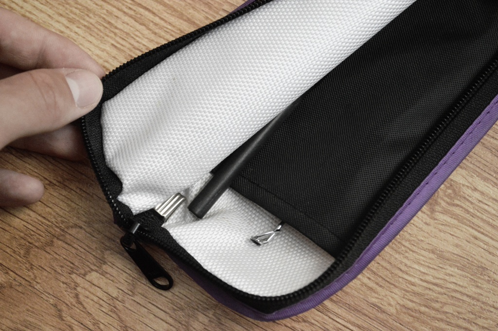 В комплекте с удилищем идёт чехол с двумя отделениями под каждую из частей спиннинга. Материал чехла довольно жёсткий и вселяет надежду на его длительное использование. Выполнен он в позитивном белом цвете с ярко-фиолетовыми обводками и золотистыми надписями, с другими его точно не перепутаешь.