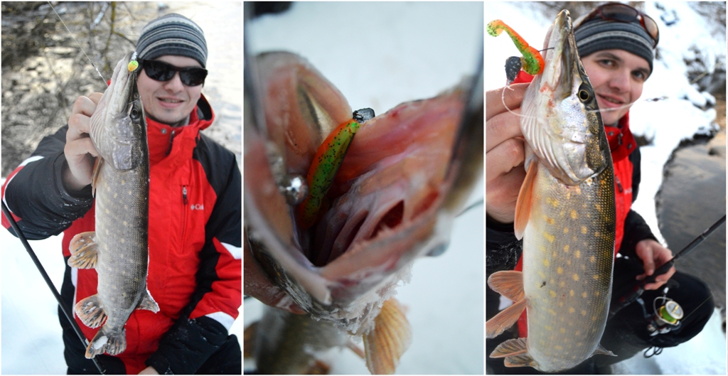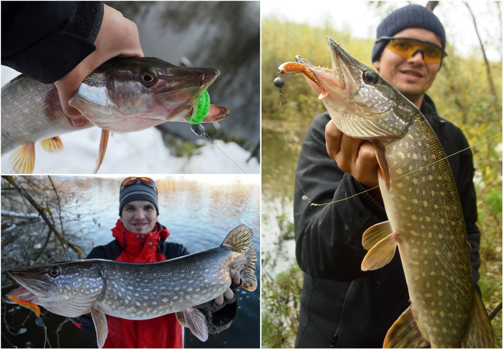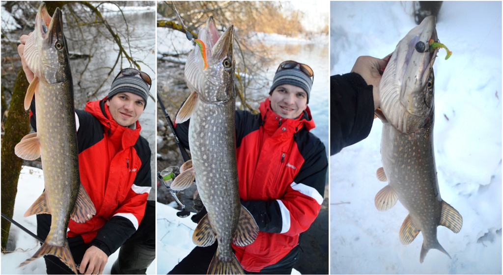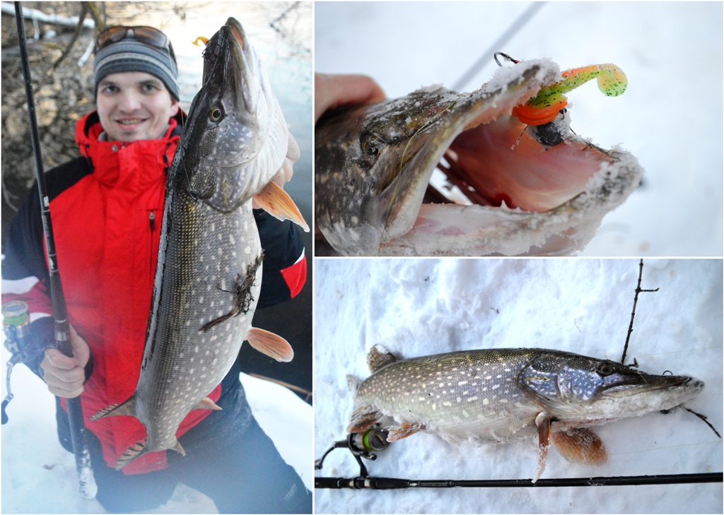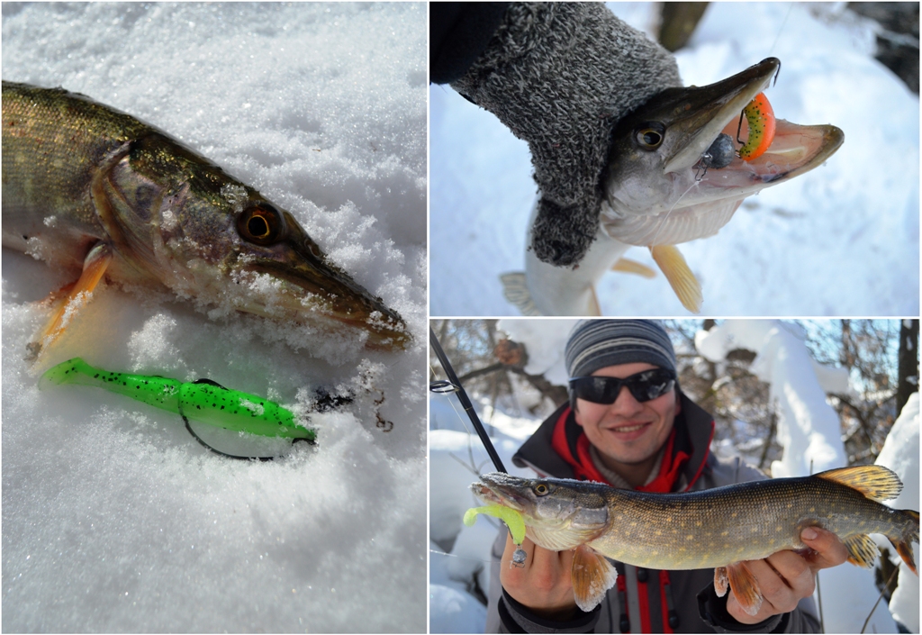 Я не стал откладывать дела в долгий ящик и через заброс вытащил щучку в районе килограмма, вот это начало! Но это было действительно только "начало". Стою в воде и, как сейчас помню, под ногами проплывает увесистая щука килограмма на два, совершенно не обращая внимания на меня - я в шоке. Но смысл уловил и срочно уменьшил вес груза, поставил то ли 10, то ли 12 граммов, уже не помню... Первая же проводка завершилась поклевкой, которую я вряд ли когда-нибудь забуду: уже подводя приманку к берегу, метрах в трех от меня, даю ей перевалиться через затопленное бревно и при падении Савамуры на дно получаю один из самых "электрических" ударов в своей рыболовной жизни, щука на самой поклевке попыталась отобрать у меня спиннинг, но меня такое положение дел не устраивало и пришлось ее максимально быстро выводить из коряг. Деликатность ситуации в том, что стоял я в окружении коряг со всех сторон и со спиннингом под 3 метра, который на финальном этапе вываживания вершинкой застрял в ветках нависающего дерева, и я произвел самый рискованный рыболовный трюк - бросил спиннинг и пока щука задумалась об эффектной свечке или перекусывании моего фрюрокарбонового поводка я схватил ее руками! Пусть и сырой по локоть в мороз, но зато 3,5 килограмма мышц и зубов у меня в руках!