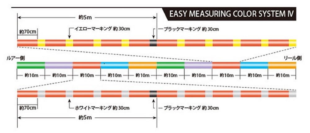Новая окраска шнура, Easy Measuring Color System IV, позволяет точно отслеживать глубину проводки и расстояние до приманки, чтобы точно знать, где произошла поклевка. Цвета яркие и насыщенные, выцветают слабо, скорее блекнут.