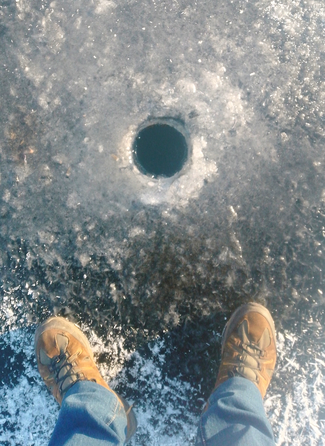 Поэтому на лёд приходится выходить в том, в чем прилетел. Если на льду наледь, то я обычно отказываюсь от рыбалки. Если лёд чистый или он покрыт снегом, то выхожу на него в том, в чем приехал.