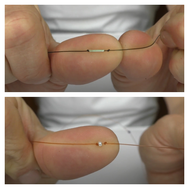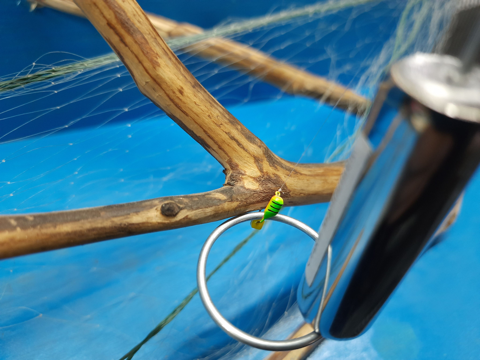 Но сама часть от удилища и леска – это не вся снасть, а только компоненты. Чтобы можно было комфортно работать ей как глубомером и иметь возможность кормить из точного яруса, необходимо нанести на леску метки. Например, спортсмены метят леску либо бисером, либо кембриками. Я пробовал оба варианта… Эстетично – да, но в плане изготовления одна сплошная головная боль. Я поступаю проще, а именно узе в узе привязываю толстые цветные нитки, для надежности на них можно капнуть и капельку клея. Из минусов, какую Вы метку ни наносили бы, она все равно будешь периодически цепляться, создавая «рваный» спуск лески, что при кормлении очень важно, иначе велик риск раскрытия кормушки где-то, но не в нужном рыболову месте. Этому выход лишь один, контролировать второй рукой травлю лески.