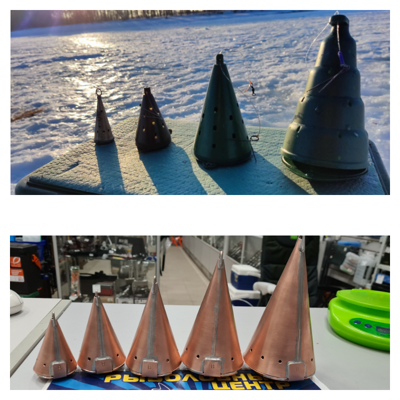 Логичным продолжением видится работа с кормушкой. Их набор достаточно стандартный: самосвал (самая большая лещовая кормушка), средняя (я пользуюсь ей при ловле плотвы и докармливаю леща), докормочная (прекрасна для работе с мотылем) и наперсток. Скажу сразу, что таскать весь этот набор с собой смысла не имеет. Достаточно двух, обычно через размер. Однако, при суточной ловле, делаю исключение, в виде дублей, например, «самосвалов».