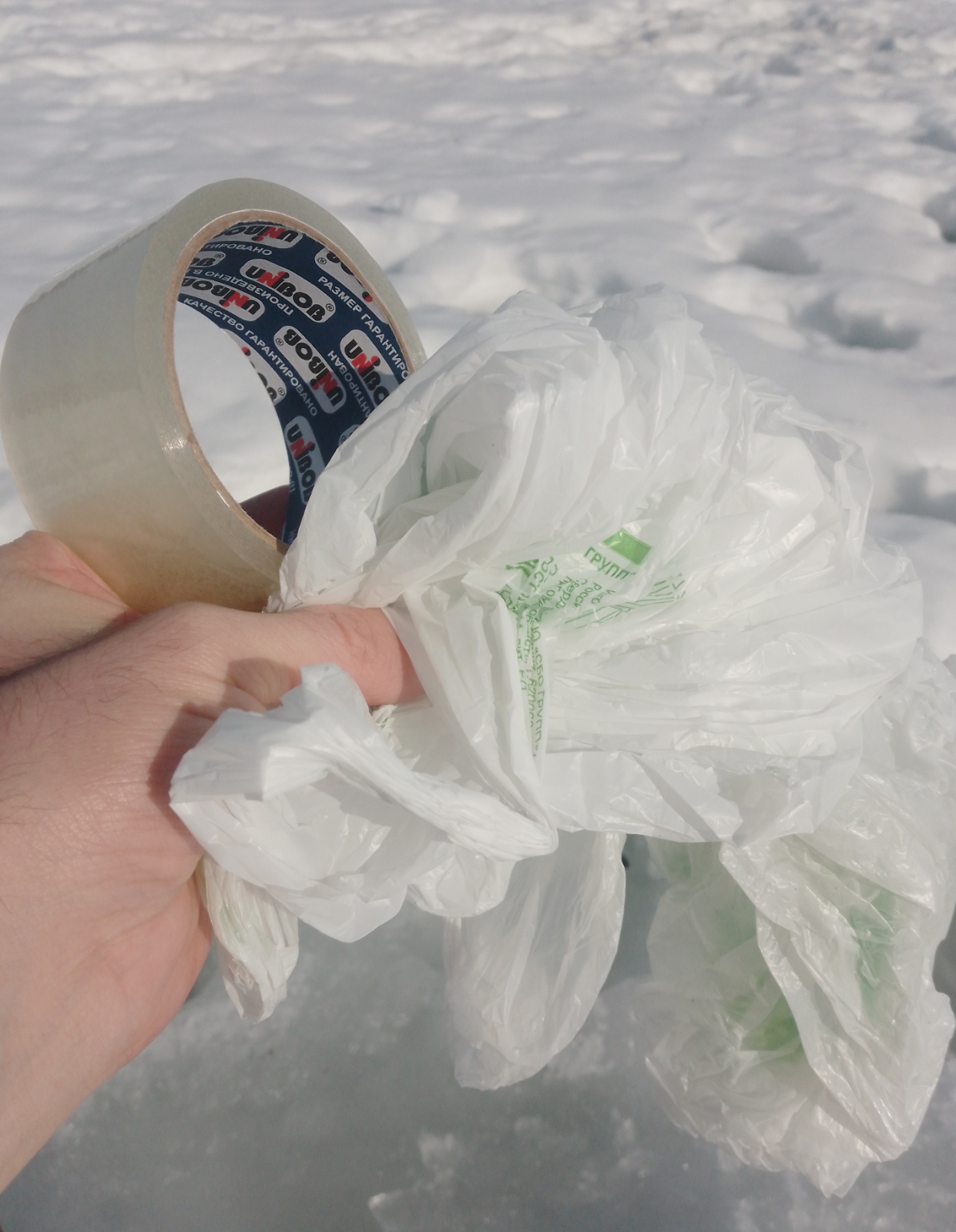 Конечно, это не панацея. И в таком виде вы не сможете протопать несколько километров, так как пакеты быстро приходят в негодность, если в них долго передвигаться. Но если мы говорим о какой-то недолгой прогулке по льду, по наледи, то такой незамысловатый метод вполне способен сохранить ваши ноги сухими и позволить рыбачить некоторое время.