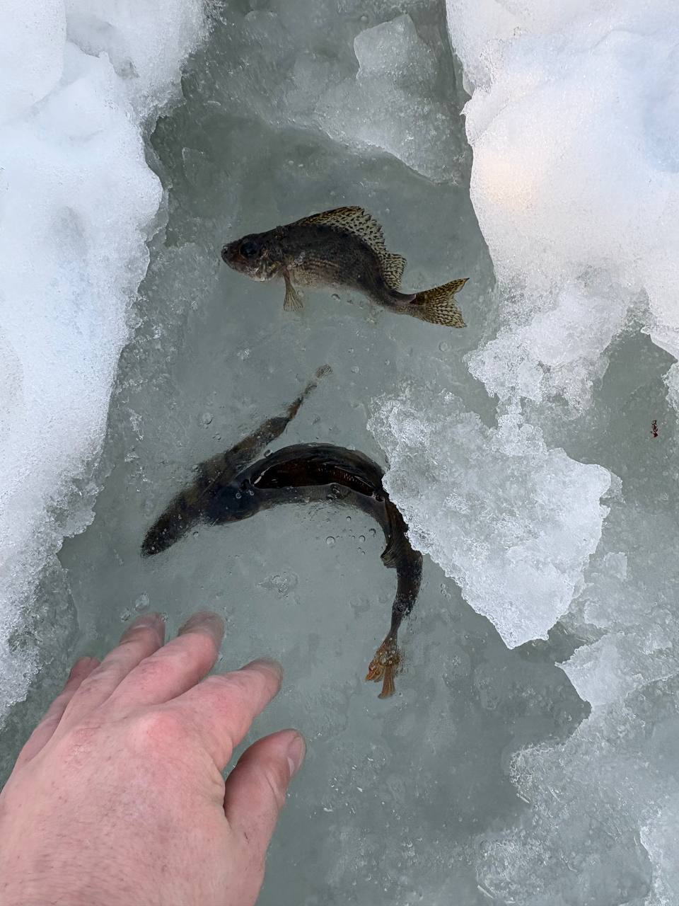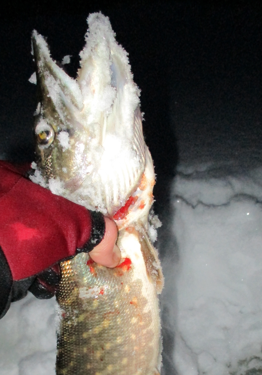Или есть какие-то следы крови на льду. Скорее всего, щука глубоко заглотила живца, повредила себе жабры и оставила такую заметную отметину на льду.
