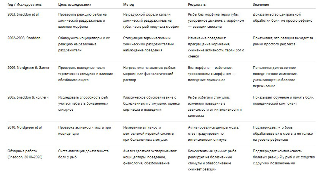 Основные исследования я скомпилировал вот в такую таблицу, из которой становится вполне очевидно, что переживание болевых ощущений рыбой - не только рефлекс.