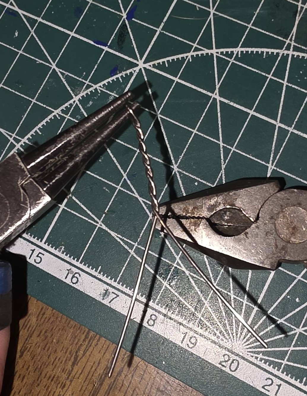4. Пора изготовить петли. Как говорил ранее, материал - нержавеющая проволока диаметром 0.7 мм. Инструменты: плоскогубцы, круглозубцы. Отрезаю кусочки проволоки по 10 см, сгибаю на середине и выполняю скрутку.