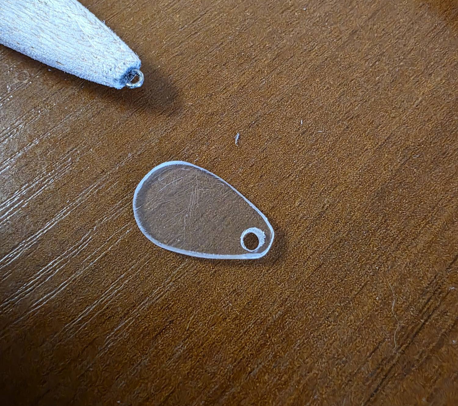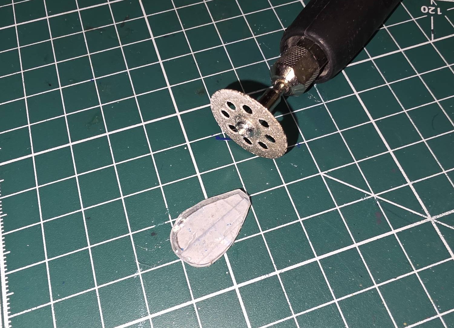 2. Закрепляю образец на кусочке оргстекла скотчем, выпиливаю гравером с режущим диском. Возможны и другие варианты изготовления лопасти, например 3д печать, или выпилить из того же оргстекла, но с помощью лобзика и довести до идеала шкуркой.