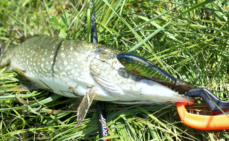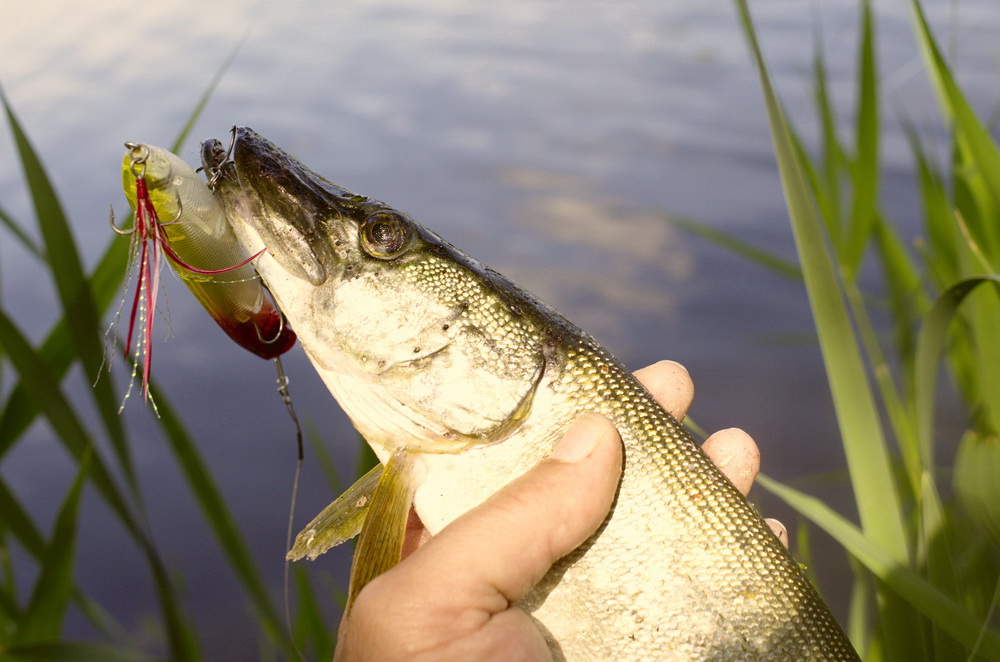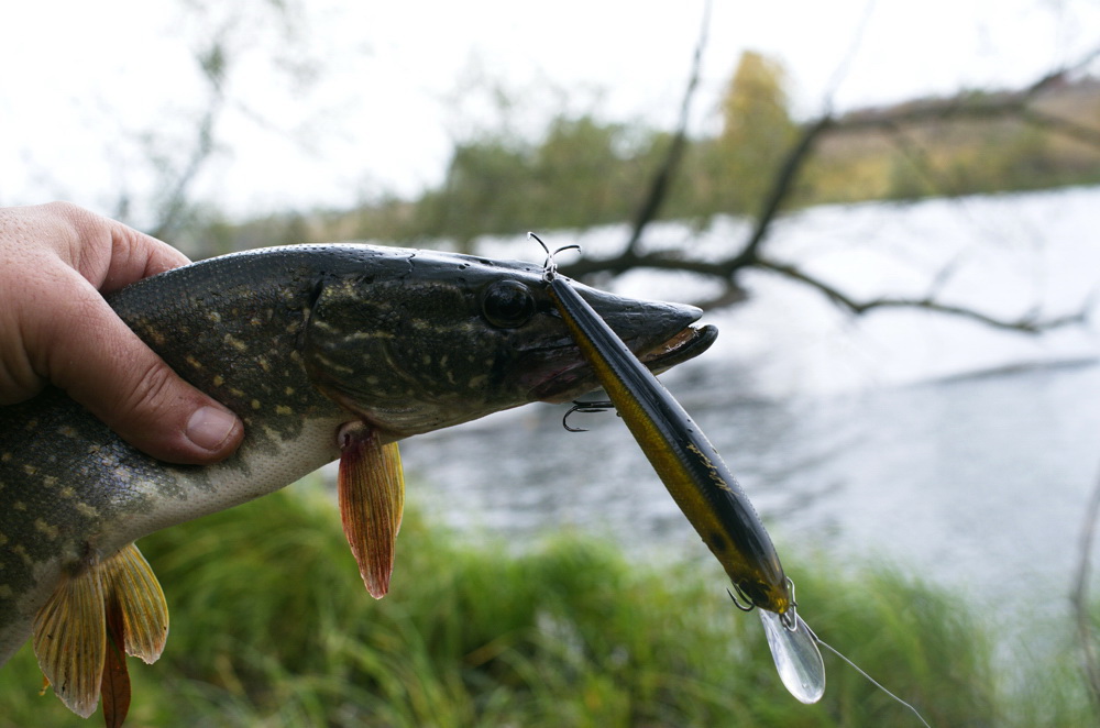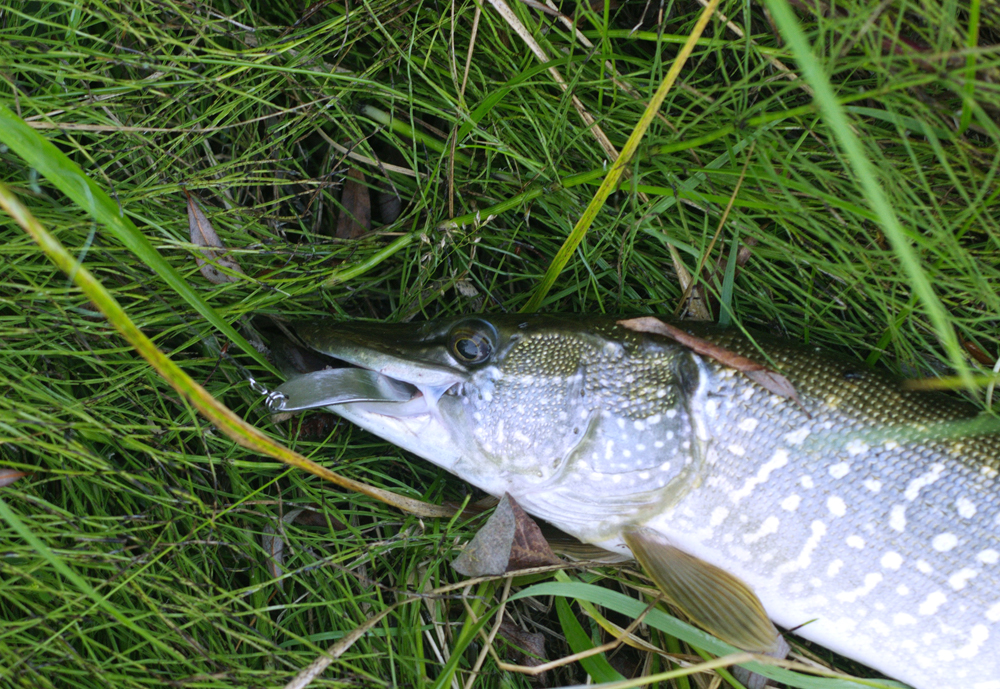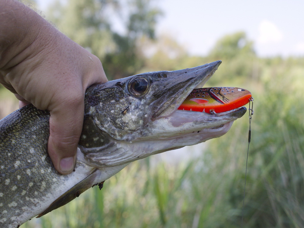 Можно было бы подумать, что в прибрежной зоне "на плюх" возможно поймать только мелочь. А вот и нет. Попадаются и двушки и трешки, и более крупные щуки.   К примеру, вот эта вот щука была поймана именно что "на плюх" возле берега, у кромки камыша.