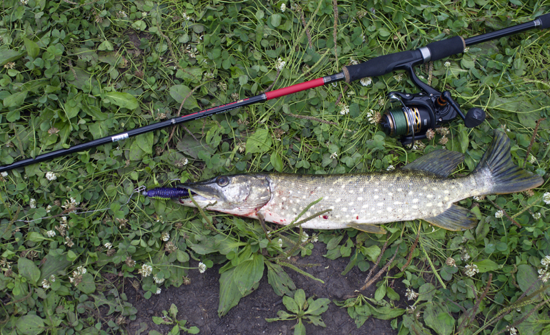 Несколько слов о снасти. Я использую фастовый двухметровый спиннинг. Катушка трехтысячная обычно. Плетенка,  как правило, не тоньше  1,5 PE, фрикцион затянут практически до предела. Это важно, потому что в коряги и заросли, которые рядом, упускать щуку нельзя.   Да, спиннинг хоть и жесткий, но с упругой серединой, это тоже важно.