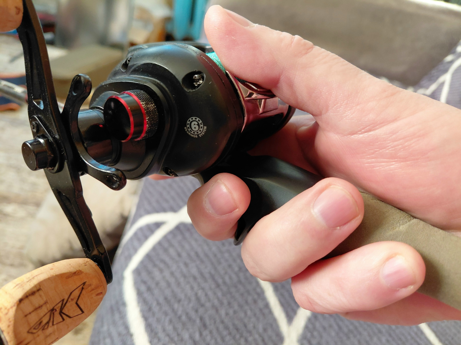 Но самое главное, самое важное в таком хвате мультипликатора — это тотальный контроль носителя, то есть лески, чего мясорубка, к сожалению, не умеет. Ведь наш любимый большой палец при таком хвате находится сверху на раме, в постоянной готовности заблокировать, прижать шпулю не только во время заброса, но и на проводке. Более того, можно и нужно, а иногда и просто необходимо выработать в себе навык блокировать пальцем шпулю на каждом ударе рывковой анимации. Прижали, дёрнули, освободили, подмотали. Надо ли говорить, что то же самое следует совершать на подсечке или вытаскивании приманки из травы? Эта история способна здорово продлить жизнь катушке, оградив её от излишних ударных нагрузок. Эта же история может продлить жизнь обгонной муфте и на джиговых проводках с большими весами, если научиться отрывать приманку ото дна с помощью удилища, а не ручки, особенно если под рукой окажется только лайтовый мульт, а вам кровь из носа понадобится поджиговать тяжёлыми чебурашками, хотя катушка для этого не очень-то и годится:) Ещё раз повторю, безынерционка так не умеет.