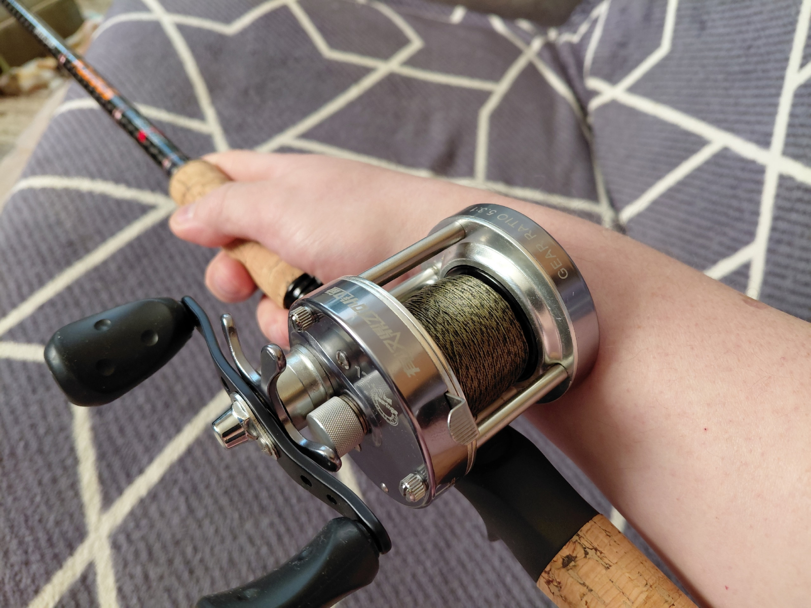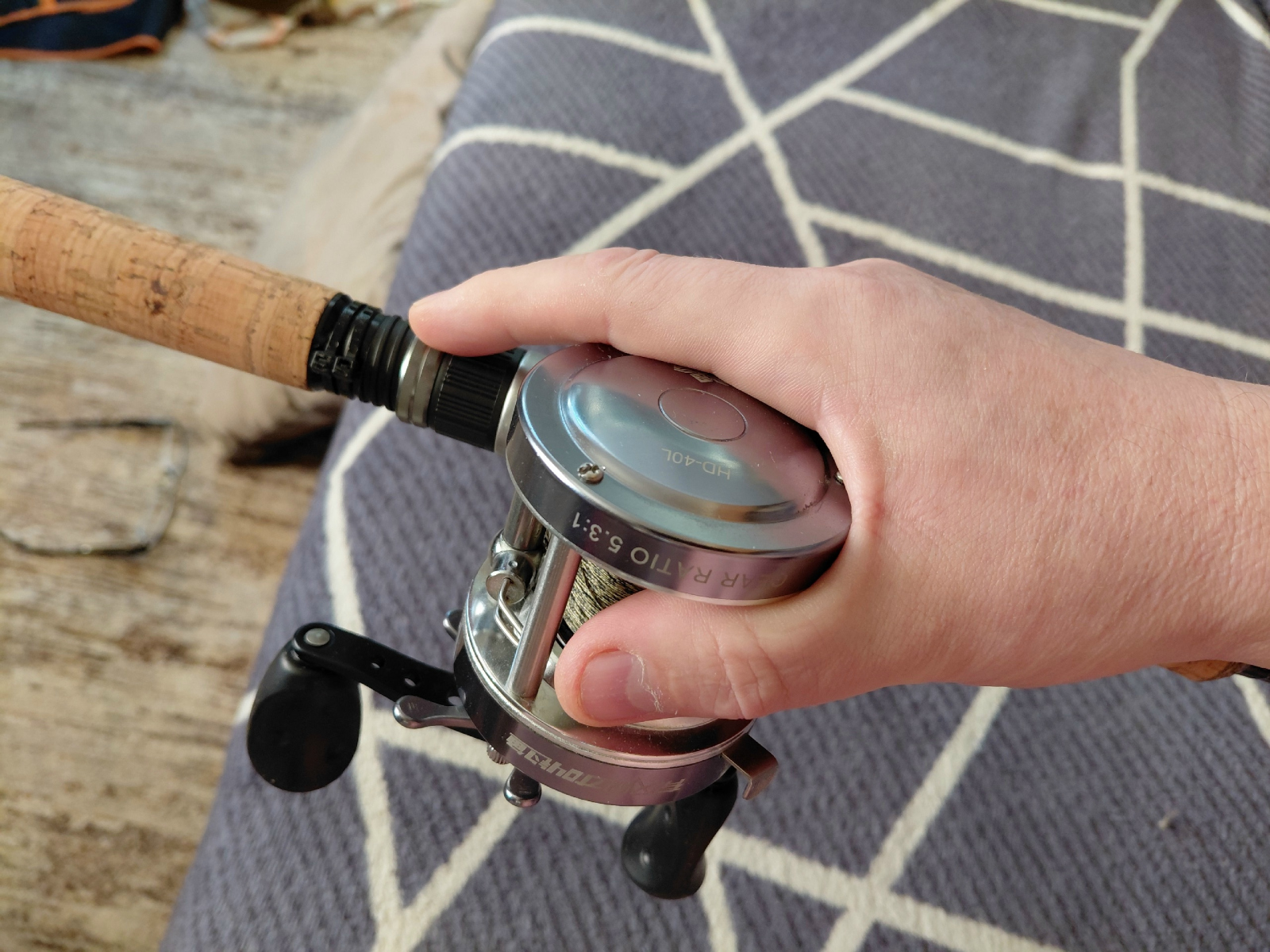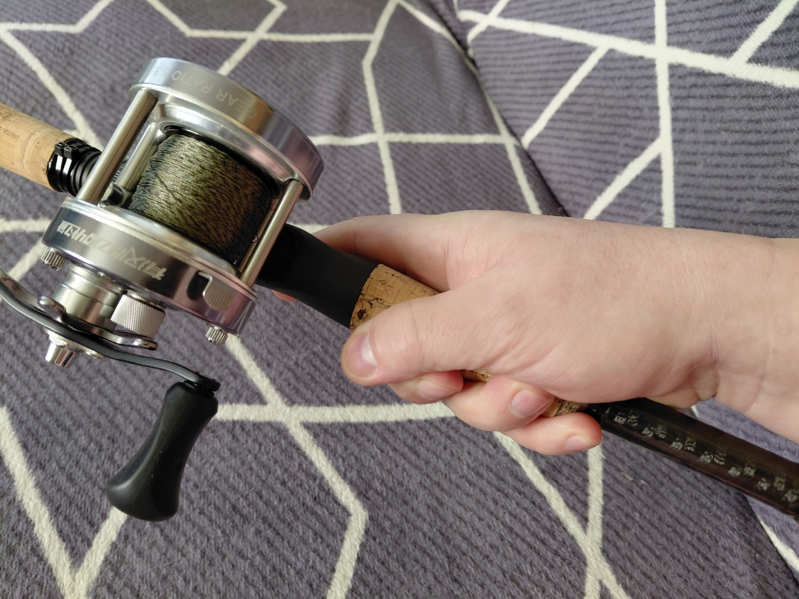 Есть ещё один приемлемый способ хвата. Это когда удилище держат перед катушкой, за форгрип. Казалось бы, так совершенно неудобно. Но после нескольких часов рыбалки двухсотграммовым джерковым удилищем с трёхсотграммовым бочонком, и приманками, способными оглушить уклейку, поневоле перехватываешься вперёд:) У подобных палок ещё и с балансом не очень, так что руки устают порядком. Тут есть один нюанс. С «мыльницей», то есть низкопрофильной катушкой, может и не прокатить, потому что леска проходит близко к удилищу, цепляясь за руку или рукав, заставляя выворачивать кисть. А вот с более высоким бочонком вполне возможно создать себе облегчение:) Лично я так и поступаю:) Контроля, конечно, идеального уже не будет, зато уставшие руки тихонько скажут спасибо:) Кстати, такой хват вполне подходит для анимации в «скандинавском» стиле, то есть катушкой. Вместо того чтобы дёргать тяжеленным удилищем, задаём приманке галсы вращением ручки. Тут главное не забыть затянуть фрикцион:)