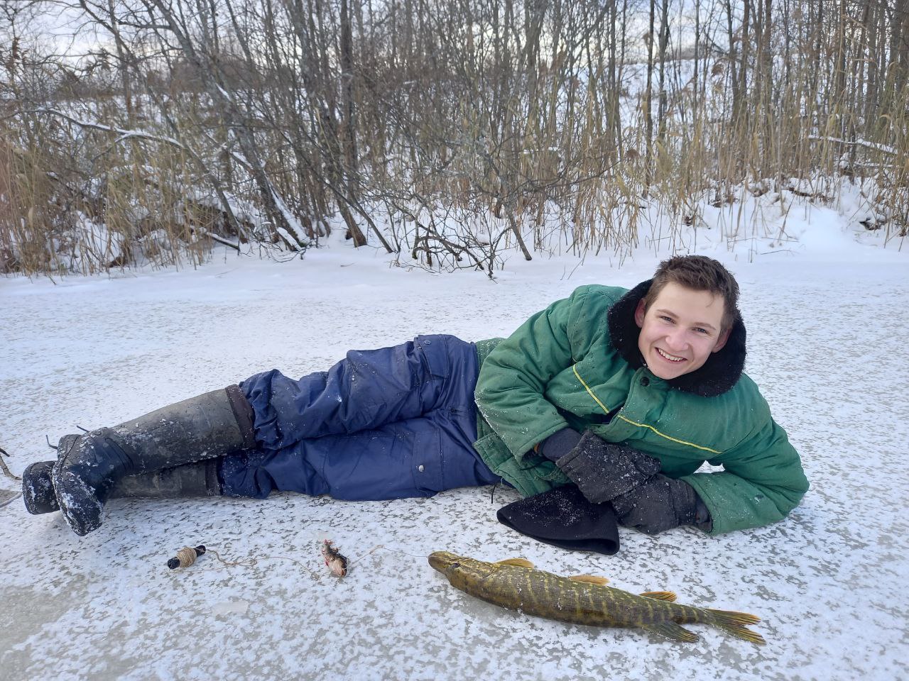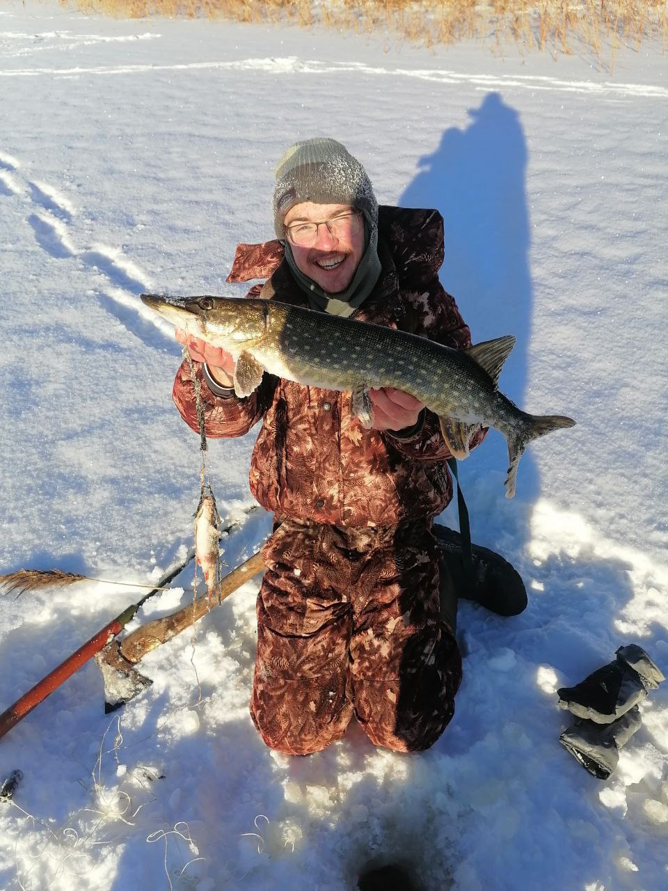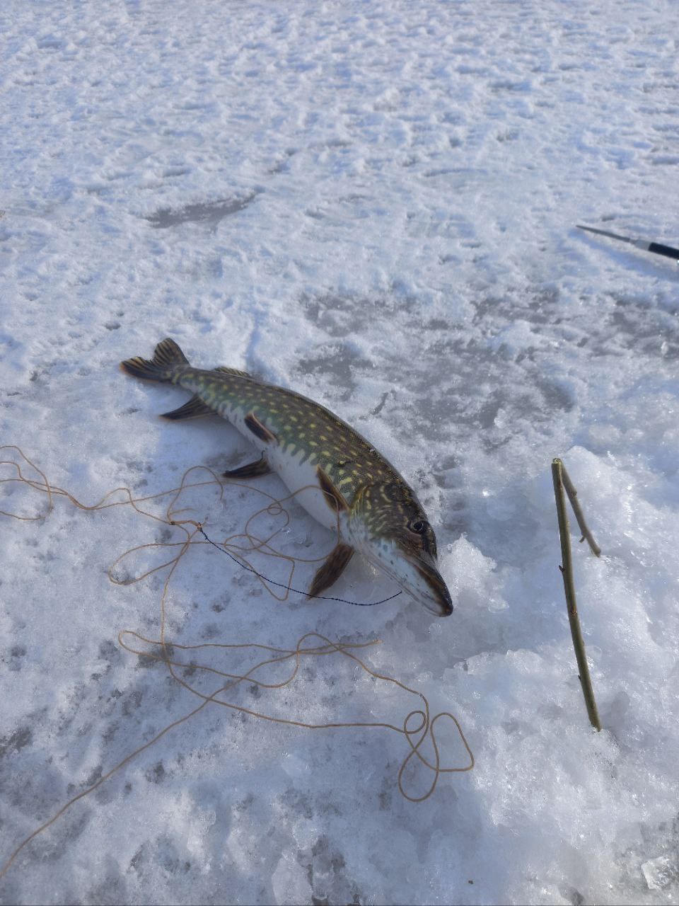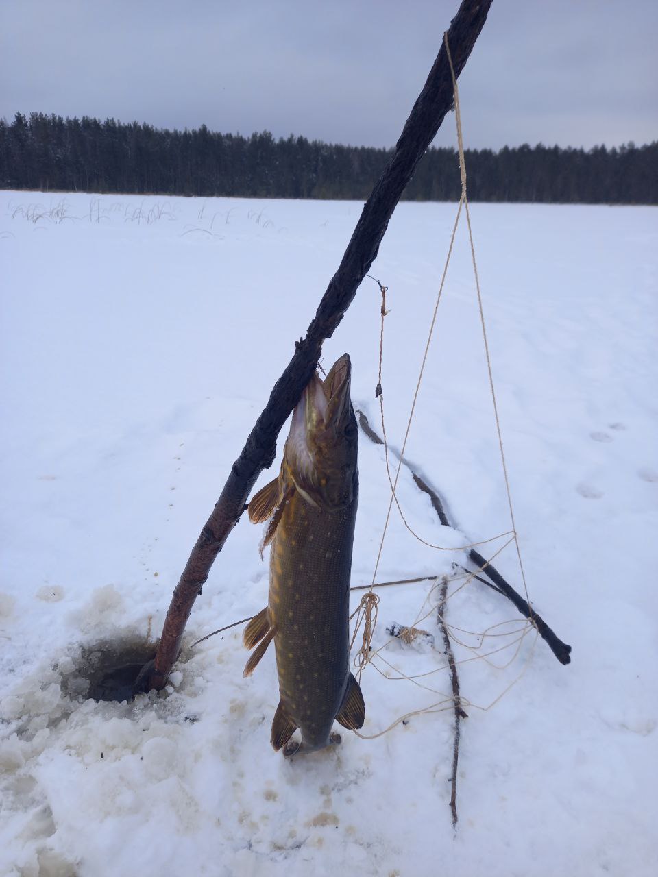 На следующий день перед моими глазами предстала нерадостная картина. Ураганный ветер легко унёс поставленные флажки по скользкому льду, и многие из них отнесло довольно далеко от лунок. А некоторые, видимо, сработавшие флажки перевернуло над размытыми лунками, и катушек на них не наблюдалось… Моей добычей в тот день стала лишь одна щучка. Рогатки Коляна же стойко перенесли все тяготы погоды и принесли ему 4 или 5 хороших хищниц…