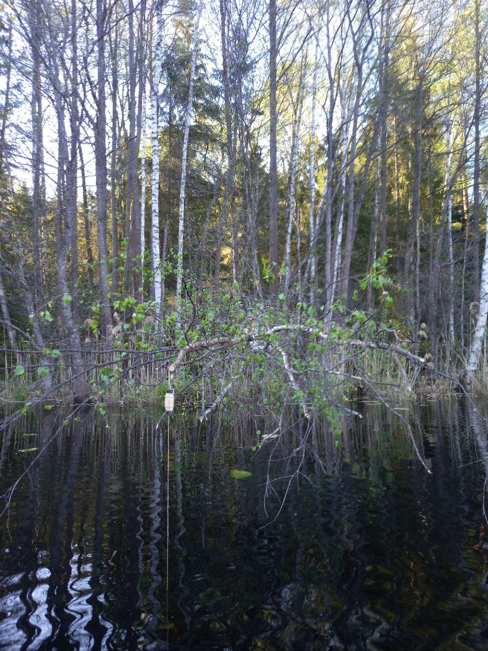 Летом же рогатки вешаются на ветки прибрежных деревьев или на заранее завезённые колы. Кол втыкается в дно или в берег (если он не слишком пологий) под углом 45 градусов или меньше: меньше угол – меньше вероятность, что бойкий живец запутает снасть о кол и приведёт её в нерабочее состояние. Способ установки ограничивает ареал применения рогатки: колы длиннее 3-4 метров срезать и установить проблематично, так что большие глубины этой снасти недоступны. Эксперименты с подвешиванием рогаток на бутылки, когда они отправлялись в свободное плавание, заканчивались неудачно – для облова глубин эффективнее традиционные кружки. Однако для озёр и речек с небольшими глубинами рогаток более чем достаточно. Есть у них и плюс по сравнению с кружками: можно быть уверенным, что снасть находится в нужном месте и не придётся гоняться за ней по всему озеру. На некоторых хорошо освоенных нами озёрах не нужно тратить время на заготовку и завоз колов: всё это мы уже сделали на предыдущих рыбалках. Например, Чёрное озеро, мелкое и сильно заросшее – не одни мы там втыкали колы, так что ресурсная база для рогаточной ловли более чем достаточная. Щуку на спиннинг там не добыть – капризная она. Как и окунь: на спиннинг нипочём не возьмёт, да и на удочку не всегда соизволит клевать. Единственный стабильный способ ловли там – ставить рогатки. Натягаешь карасей на пруду, поставишь на ночь десяток рогаток – и, как правило, попадётся на следующий день щучка-другая.