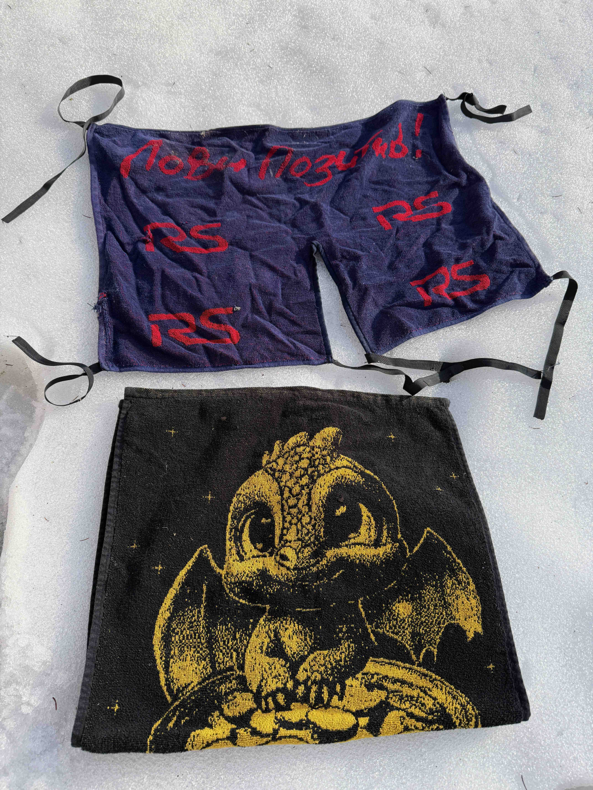 Можно взять любое домашнее с кухни под неодобрительный взгляд супруги, можно какое-нибудь подаренное с фирменной надписью "кока-кола", "билайн" или еще хуже "ооо пром-транс-краб-снаб-инвест-гарант", но лучше все-таки приобрести один раз специальное полотенце для рыбалки.