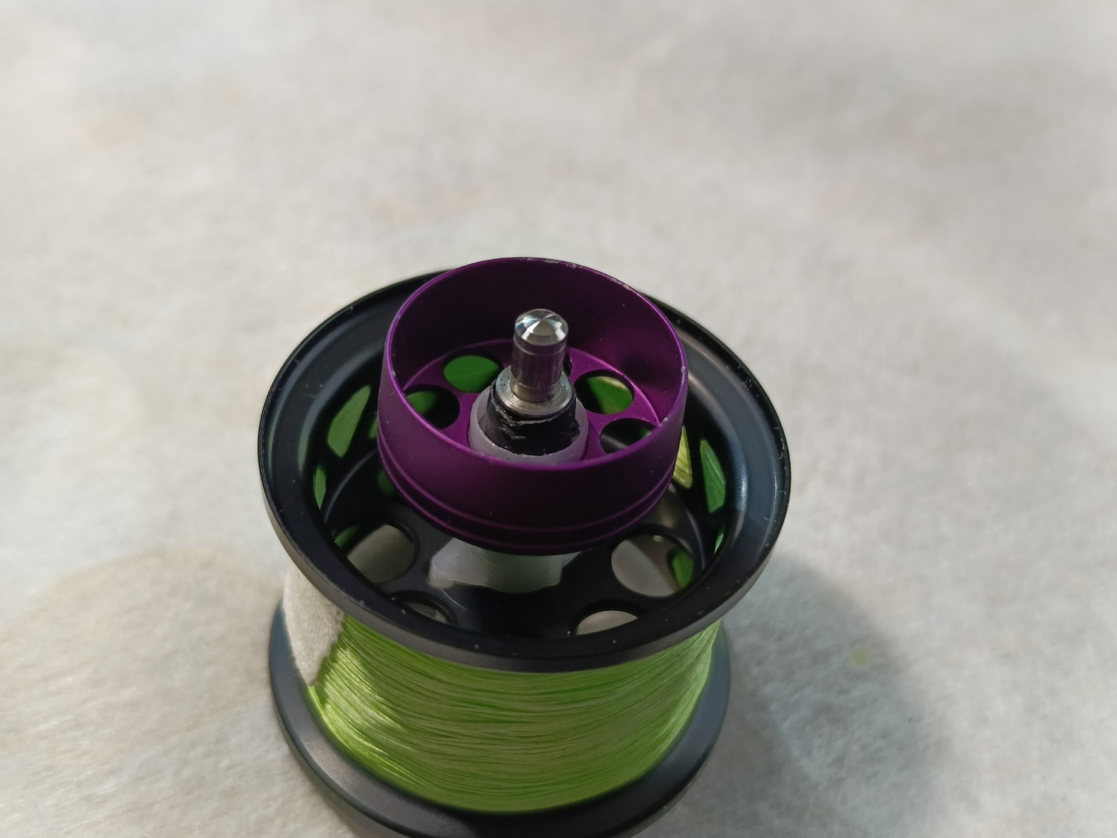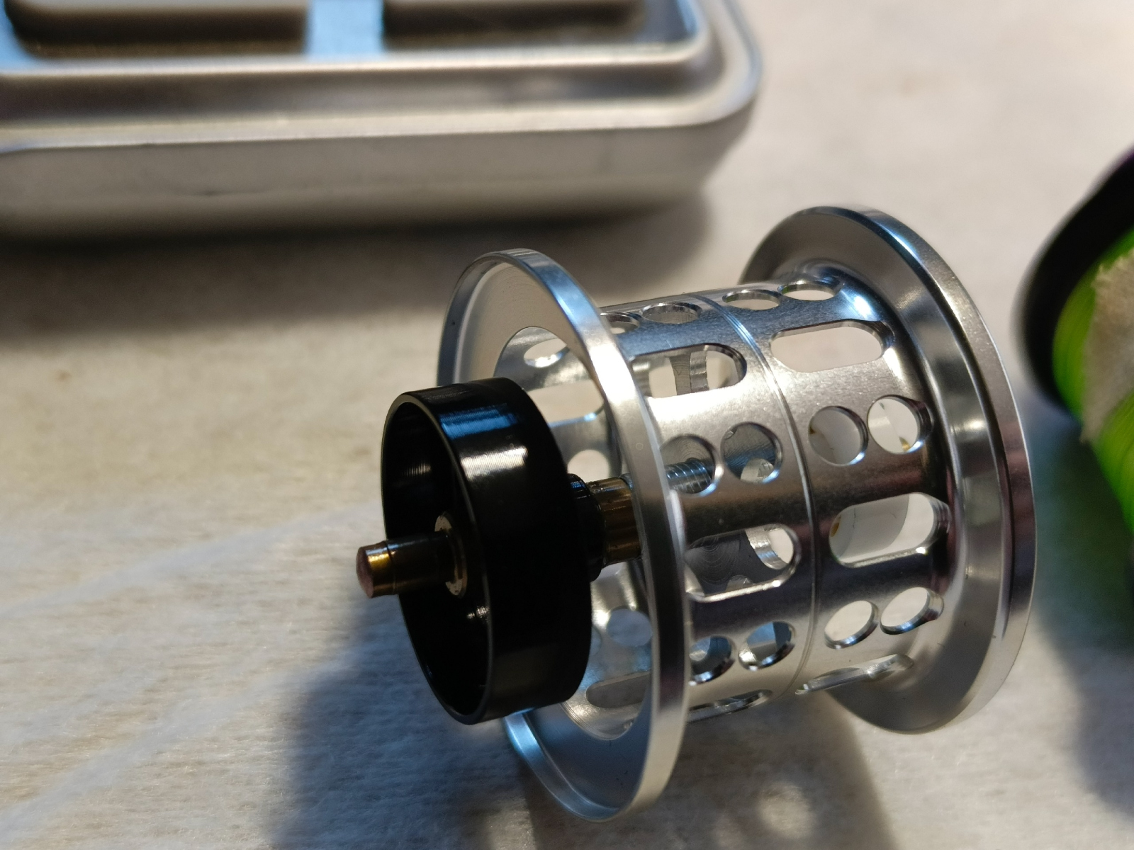 Вернувшись домой, разобрал злополучную шпулю Рейстудио. Это не сложно, надо только снять аккуратно разрезную шайбочку, что держит индуктор. А дальше снимаем индуктор,вытаскиваем пружинку, устанавливаем индуктор на место. Но вместо разрезной стопорной шайбы надеваем на ось кусочек термоусадки подходящего диаметра. Я подобрал такого, что даже греть не пришлось, просто натянул на ось до индуктора.