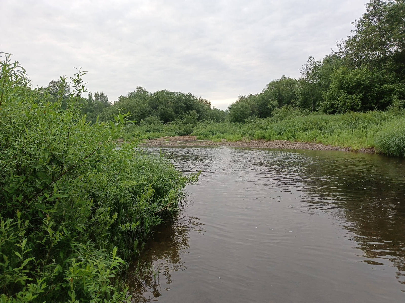 А надобно же ещё сказать про условия ловли на той речке. Множество кустов справа и слева, и не менее сзади, сильно ограничивали заброс. Приманку (обычно я использовал веса от 2 до 8 г.) можно было забросить только коротким оверхэдом и довольно длинной палкой.