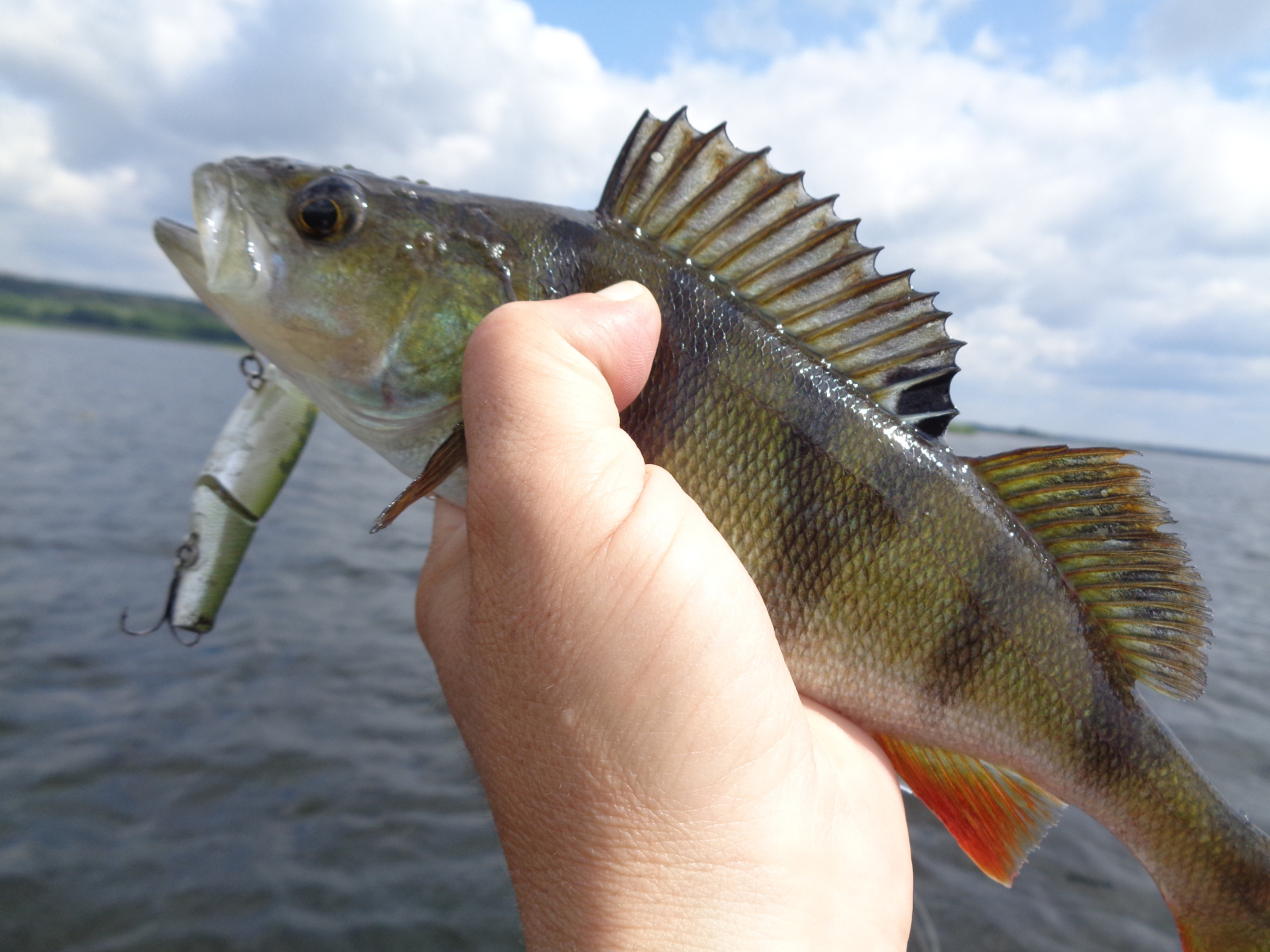 Признаюсь, после покупки Tiny Magallon я возлагал на него большие надежды. В принципе, мне было по – барабану то, что он ловит, в основном, шнурков. Скажу так: изделие отлично работает на мелких и не глубоких речках. Именно, под такие условия ловли я его и покупал, просто интересно было в то время освоить одну мелкую речку. И я её освоил с помощью Tiny Magallon. Честно сказать, тогда я сильно в него не упирался, провёл серию рыбалок, и интерес мой пропал, потому что тогда я перекалечил множество шнурков, причём влетали они один за другим на простой проводке, которая заключалась в так называемой эстонском твичинге. Я забрасывал приманку вдоль берега и проводил его по принципу одного известного рыбака: - «тинь, тинь, пауза в пять секунд». Фоток тех нет, тогда я их не делал, вставлю фото Челябинского окуня с Первого озера: