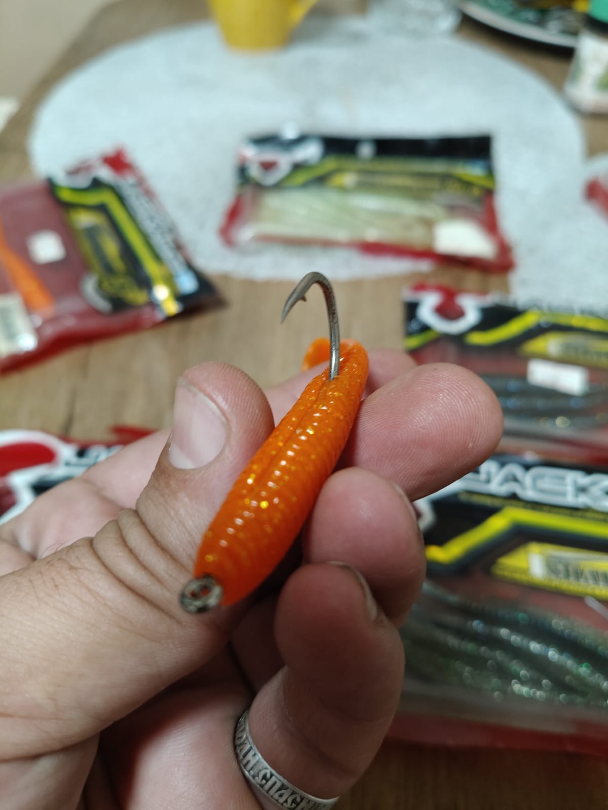 Однако миниатюрность миниатюрностью, но это вообще не отменяет вариативность монтажа приманки. Ну про банальный одинарный открытый крючок и так все понятно – классика! Да и офсетник можно запихнуть в ту же классику. Тем более, что для удобства его монтажа есть специальная прорезь в спинной части приманки для максимально удобного сокрытия острия крючка. А со стороны брюха есть небольшая прорезь для более удобного соскальзывания крючка и «складывания» приманки в момент поклевки. А вот для офсетников миниатюрность приманки идет только на пользу! Можно использовать всевозможные варианты с разной глубиной поддева. Ну а для продления жизни приманки, я все же рекомендую использовать при монтаже офсетника ввертыш – надежней. Однако возникает вопрос, а как быть с двойным крючком и джиг-головкой? На самом деле – это все более чем приемлемо и допустимо. Важно только соблюдать одно простое правило – цевье должно быть не слишком толстым, пропорциональным толщине приманки. Это касается и напайки свинца на джиг-головке, и петли на двойнике!