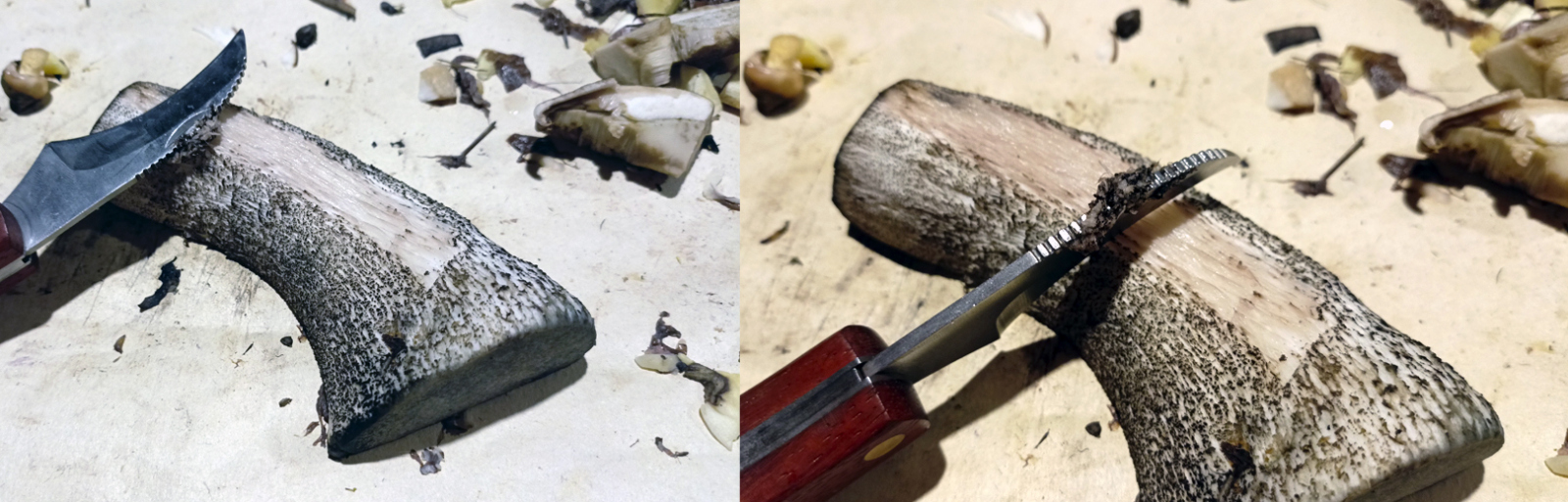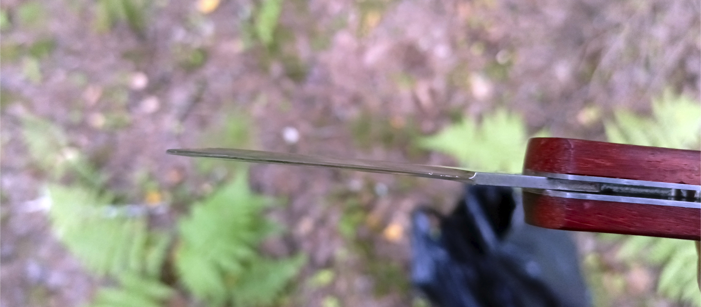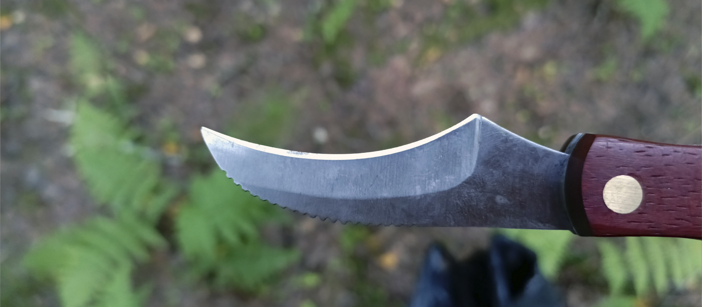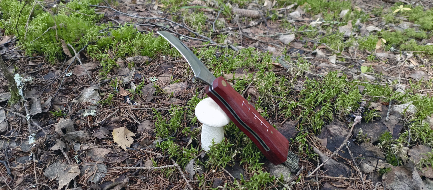 Начиная от рукояти, клинок имеет закругленную форму. Так лезвие огибает ножку и позволяет счищать с нее чешуйчатый слой значительно быстрее. Крайняя часть лезвия, напротив, почти прямая и помогает при последующей разделке гриба.