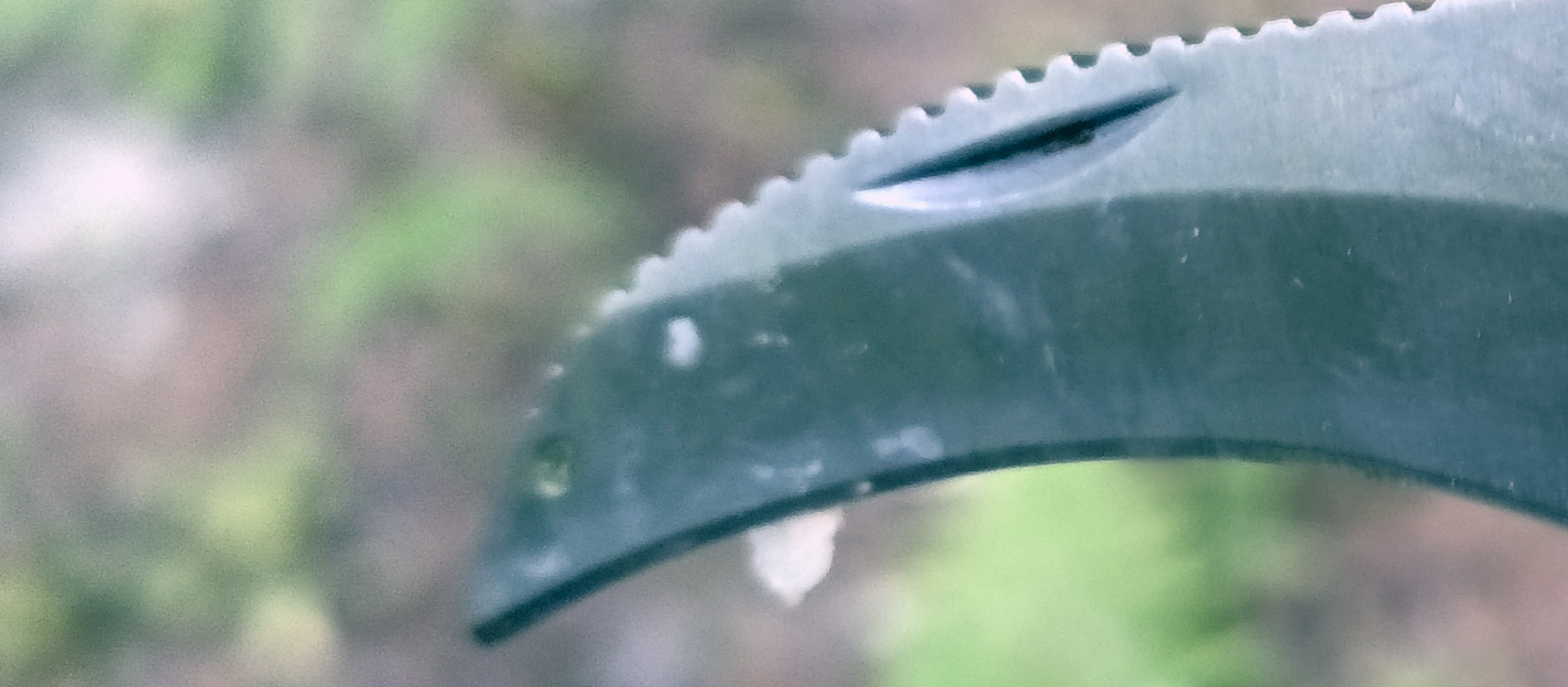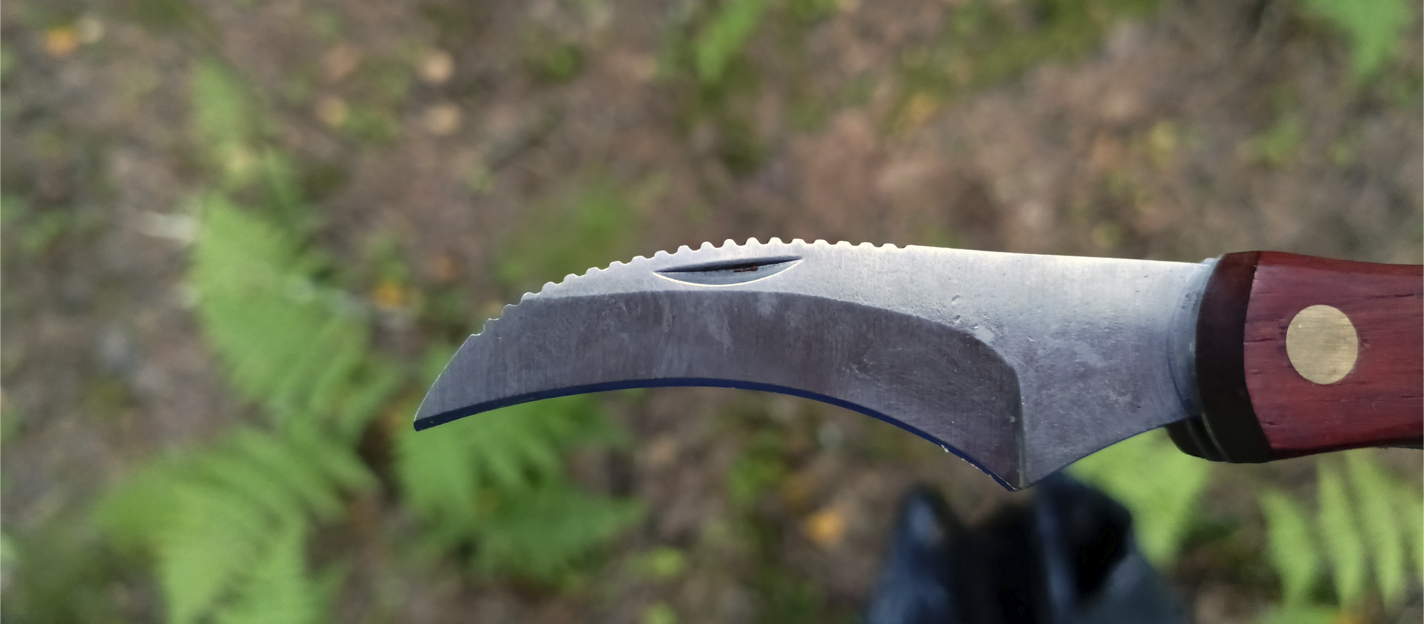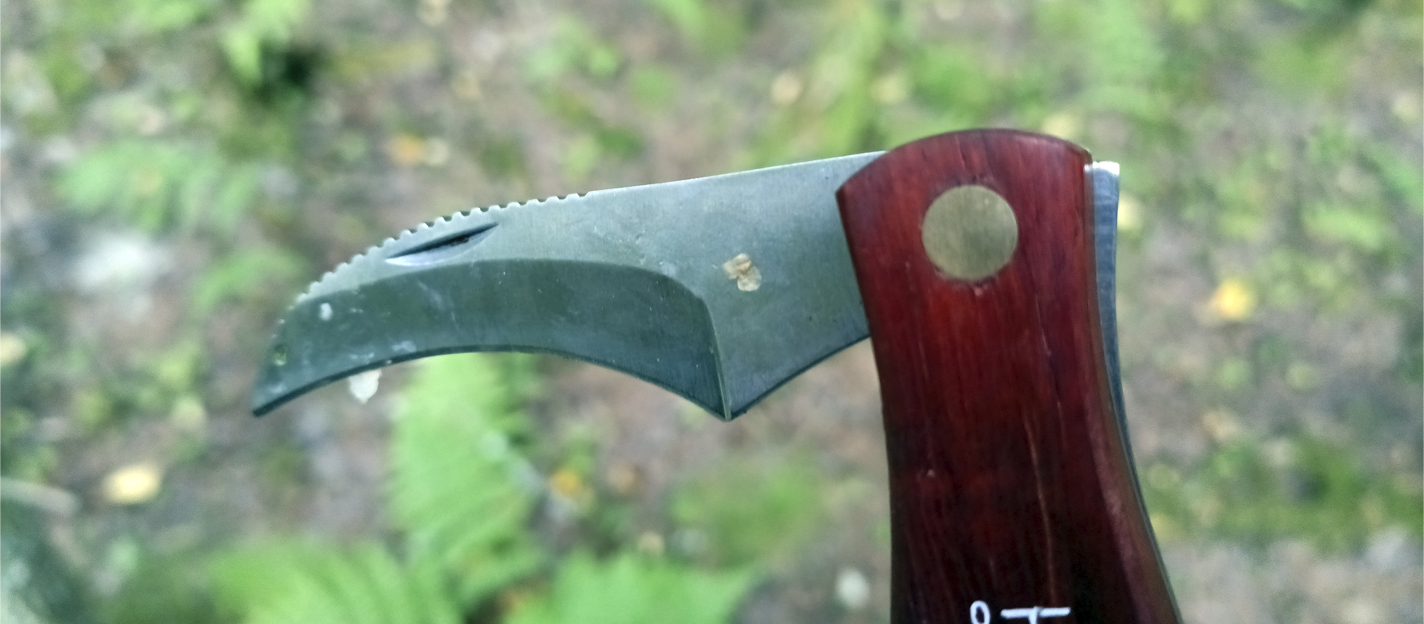 Со складными ножами, имеющими серповидное лезвие, я знаком давно: в советское время люди повсеместно пользовались ими в хозяйстве и назывались они садовыми. Спустя много лет, во время командировки на космодром, я заметил, что старые опытные электромонтажники разделывают и зачищают силовой кабель именно такими ножами: острый конец позволяет без труда разрезать изоляционный слой, не повредив при этом медную часть провода.