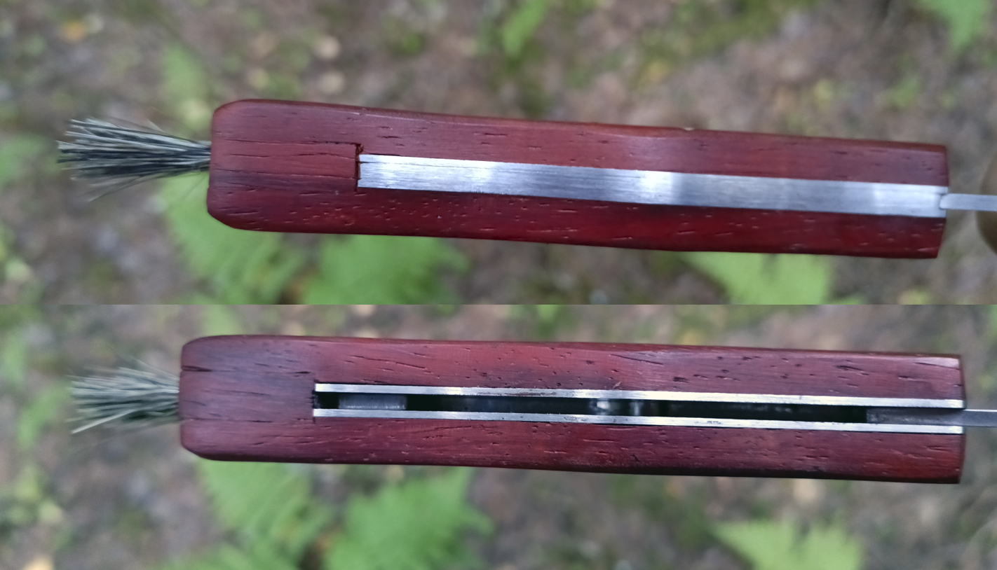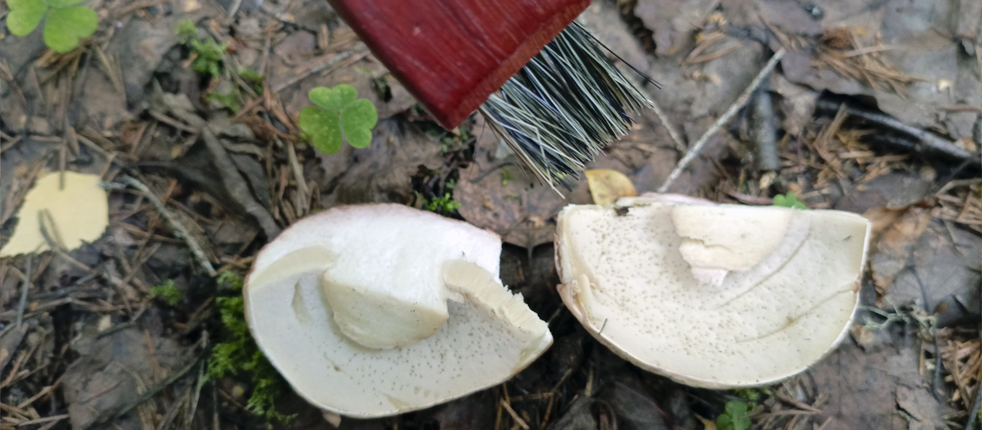 Очень полезное приспособление - щеточка с обратной стороны ножа. Это, скорее всего, натуральная жесткая свиная щетина. Когда лезвие ножа убрано, получается словно отдельный узкоспециализированный, притом безопасный, инструмент. Такой щеткой можно быстро и просто счистить с гриба сосновые иголки, листву, песок. Так что в кузов или корзину попадает уже практически готовый полуфабрикат, который лишь останется порезать дома на кубики.