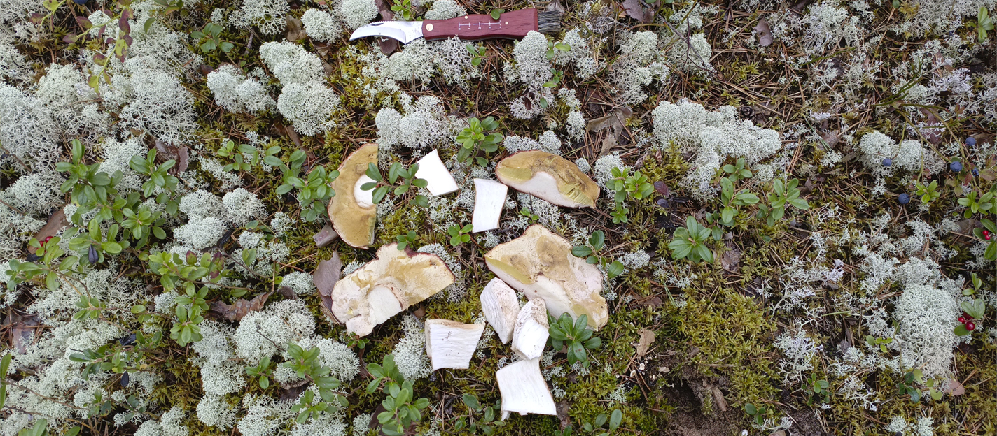На фото - как раз один из тех моментов, когда я оценил по достоинству свое приобретение: ходил за черникой, но по пути попалась куча молодых маслят, белых и подосиновиков. Нож был при мне и помог быстро собрать и обработать на месте всю грибную рать.