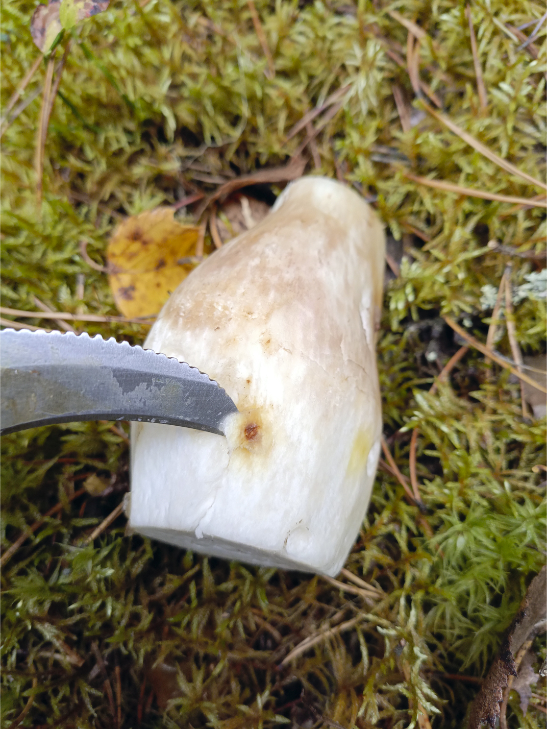 Лезвие сужается к краю и имеет острый кончик, которым удобно вырезать с гриба мусор и червоточину.