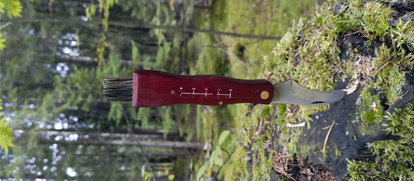 - на рукоять нанесена линейка с сантиметровыми делениями, 4 см - для измерения величины шляпки гриба;