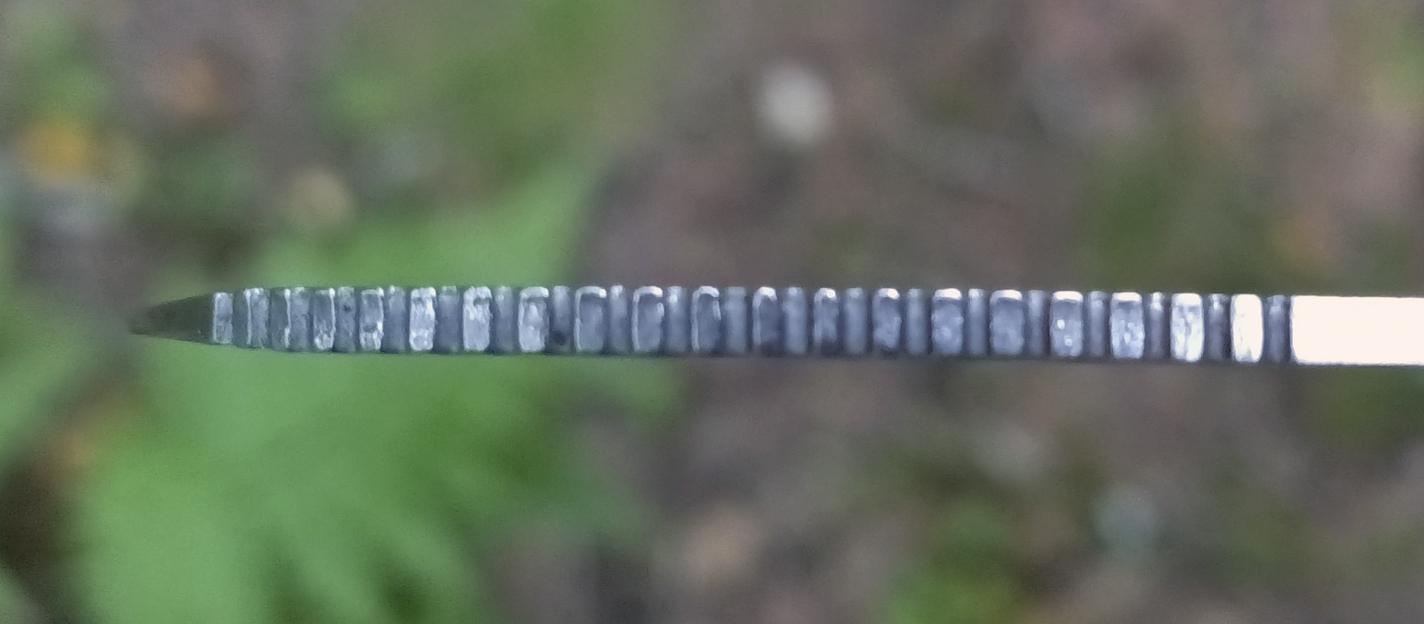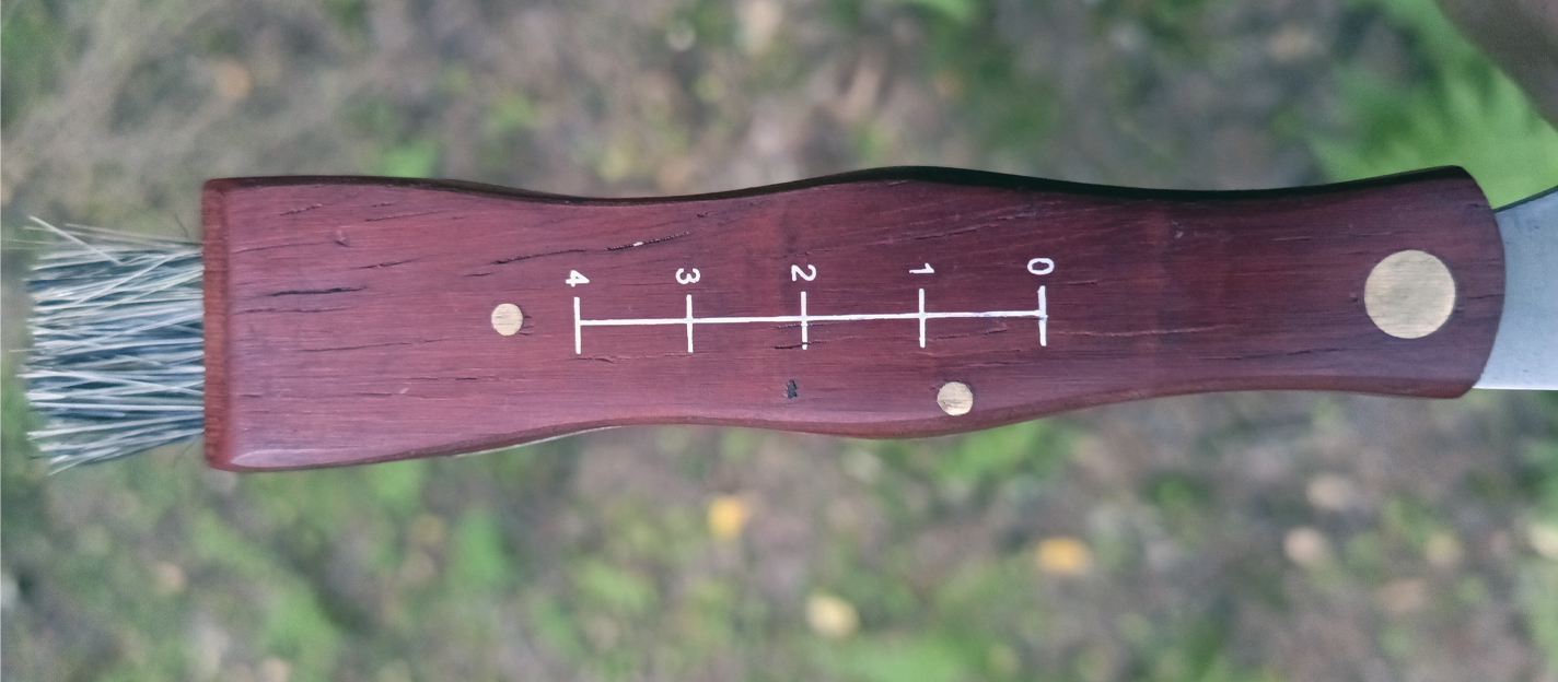 На рукоятке ножа нанесена шкала с делениями через сантиметр. Большинство из читателей сейчас, думаю, даже не догадаются, зачем это нужно. В последние годы в регионах России все шире развивается бизнес на сборе грибов. Приёмщики делят грибы не только по виду, но также и по сортам, в том числе в зависимости от размера шляпки. Вот, видимо, производитель и посчитал, что грибникам такая насечка будет полезна.