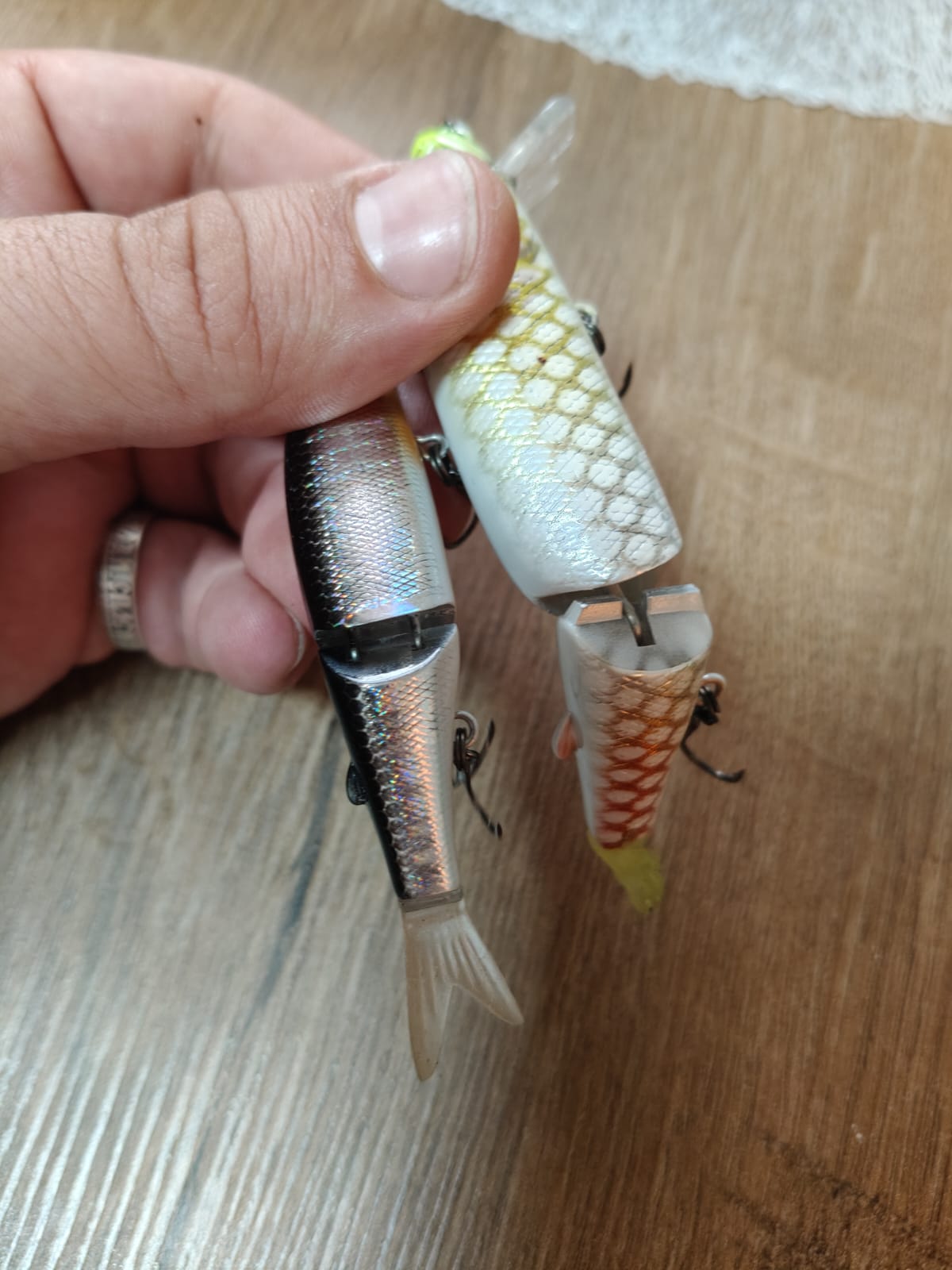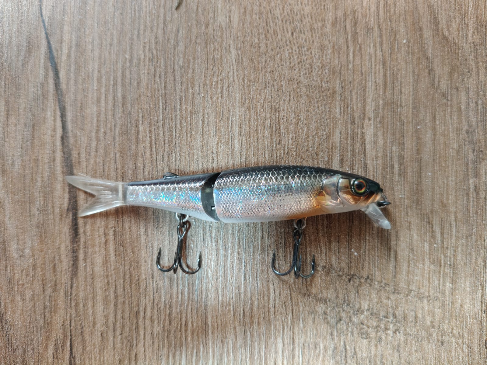 Однако, несмотря на общую схожесть большей и меньшей приманок, Jackall Tiny Magallon имеет ряд отличительных особенностей в строении. Так, например, если Jackall Magallon делится шарнирным соединением в соотношении 2/3 и 1/3, то Jackall Tiny Magallon делится практически пополам. Почему практически, да потому что головная часть чуть-чуть больше хвостовой. Я бы даже сказал незначительно. А вот следующее отличие более заметно. Заключается оно в самом устройстве шарнирного соединения. В отличие от Jackall Magallon, шарнир у нашего малыша выполнен не с помощью одной точки крепления, а двух (в спинной и брюшной частях). Да и выемка в приманке в месте шарнирного соединения у Jackall Tiny Magallon меньше, чем у старшего собрата, что в свою очередь делает угол отклонения хвостовой части меньше, чем Jackall Magallon.
