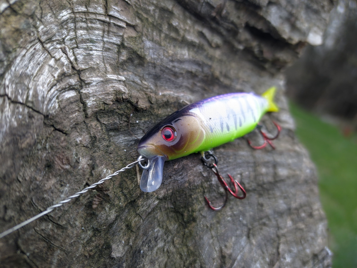 Однако, небезупречен и герой обзора — ему от рождения прописали неадекватно мелкие для «щуколовки» тройники, больше подобающие какой-нибудь 70-ке (туда они и пошли, на копию Риджа от Акары, где родные были огромными). С ними воблер был плавающим, с положенного «Тинику» размера овнеровскими «десятками» стал суспендером с легким плюсом, плюс 15 см поводок «Контакт» весом 0.2 гр — медленно тонущим.