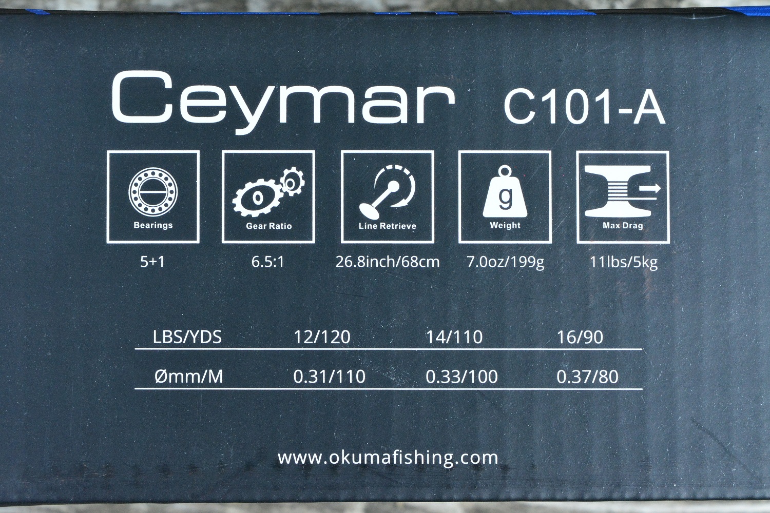 Следующая пиктограмма на боковой стенке коробки говорят нам, что весит Okuma Ceymar C101-A 199г. Что влияет на этот параметр? Конечно же используемые материалы. В данном случае, это металл, пластик и высокомодульный карбон.