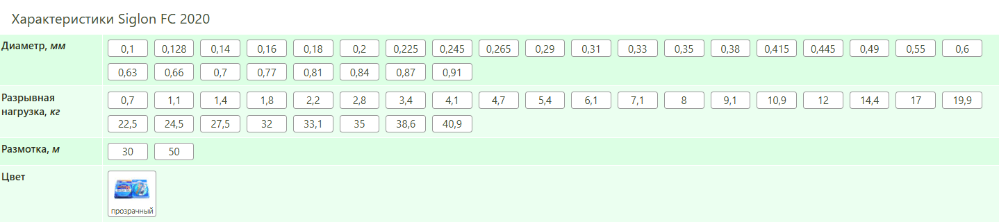 Широкий спектр представленных диаметров флюорокарбона Sunline Siglon FC 2020 от 0,1 мм до 0,91 мм, с разбегом в две сотых миллиметра, позволяет подобрать нужный под любой тип ловли и под самую капризную рыбу. Минимальные диаметры подойдут для любителей деликатных снастей, в таких видах ловли как мормышинг, наноджиг и микроджиг, средний диапазон диаметров перекрывает все необходимые диаметры любителям ультралайта, лайта и медиумджига, ну а диаметры от 0,5 мм до 0,91 мм помогут любителям тяжёлого джига в их трофейных рыбалках.