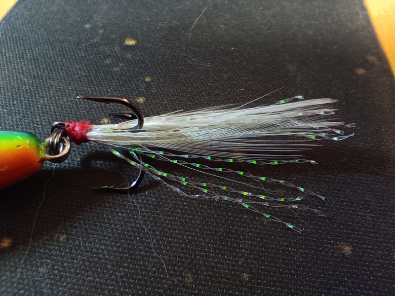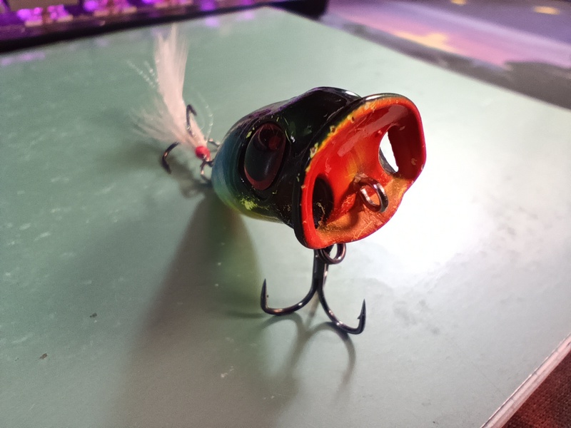 Оснащен парой тройников. Родные крючки крепкие, острые, но что немного удивило – задний без какой-либо опушки, как это обычно принято у большинства попперов. Так что я допустил вольность и произвел небольшой апгрейд, установив сзади соразмерный тройник с перьями и люрексом.