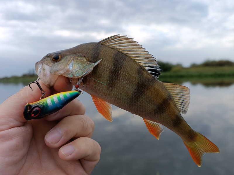 Ну и самое главное, каков он в работе. Вот за что полюбил этого TsuYoki, так за стабильную игру. Это великолепный вариант для тех, кто впервые хочет освоить поверхностную ловлю. Можете дергать удилищем вверх или в бок – Zoki работает. Даже небольшое волнение и рябь не сбивают его. Благодаря свей геометрии и балансировке на каждом рывке создает аппетитный «бульк» и брызгается водой. Практически не подныривает, как некоторые другие экземпляры, что считаю сразу ставит крест на подобные приманки. При высокой активности ведите его непрерывно, короткими рывочками. Окунь все равно догонит и сожрет его, а может и дуплетом влететь (по одному полосатому на каждый из тройников). Причем в качестве трофея могут быть как фестивальные матросики, так и солидные горбачи, так как размер позволяет.