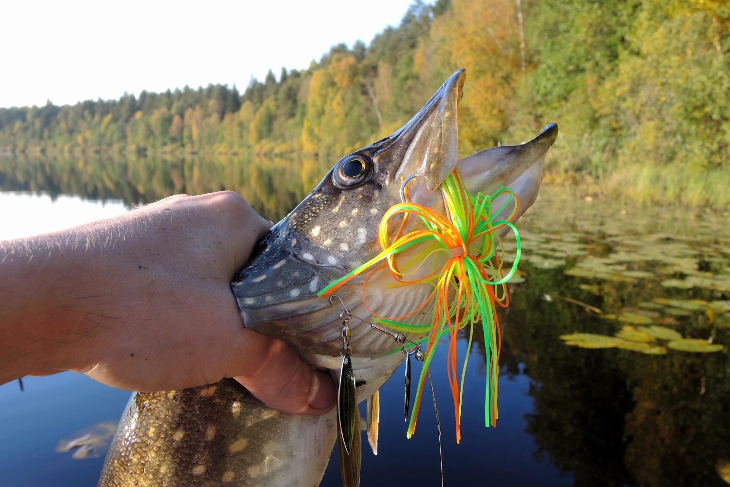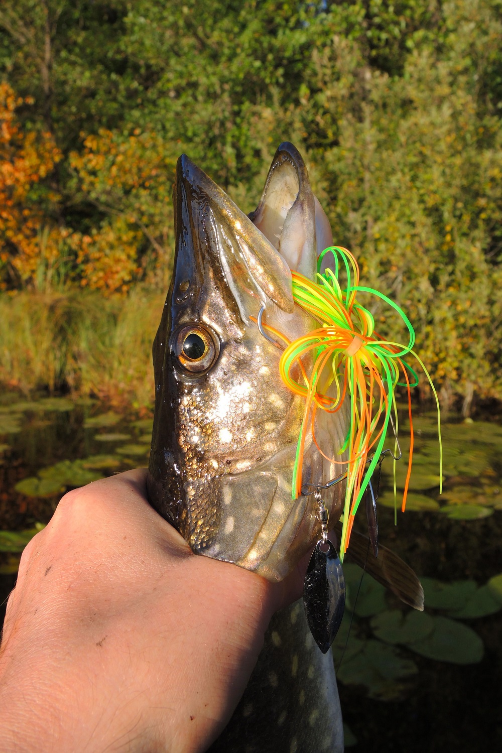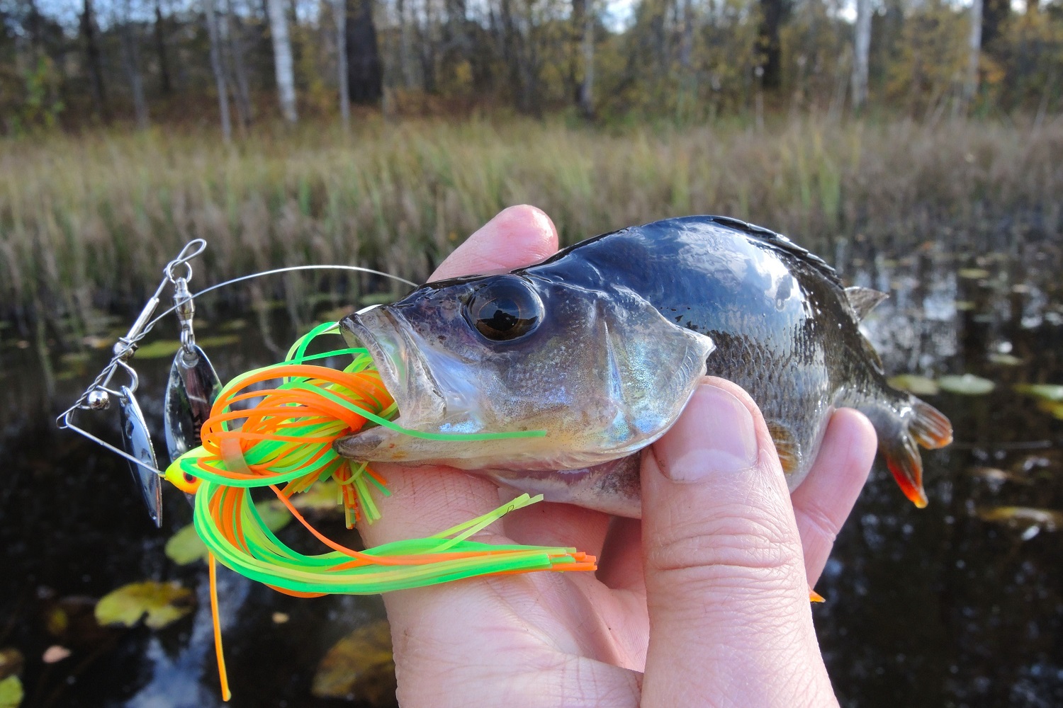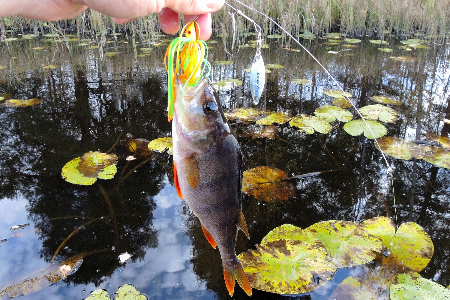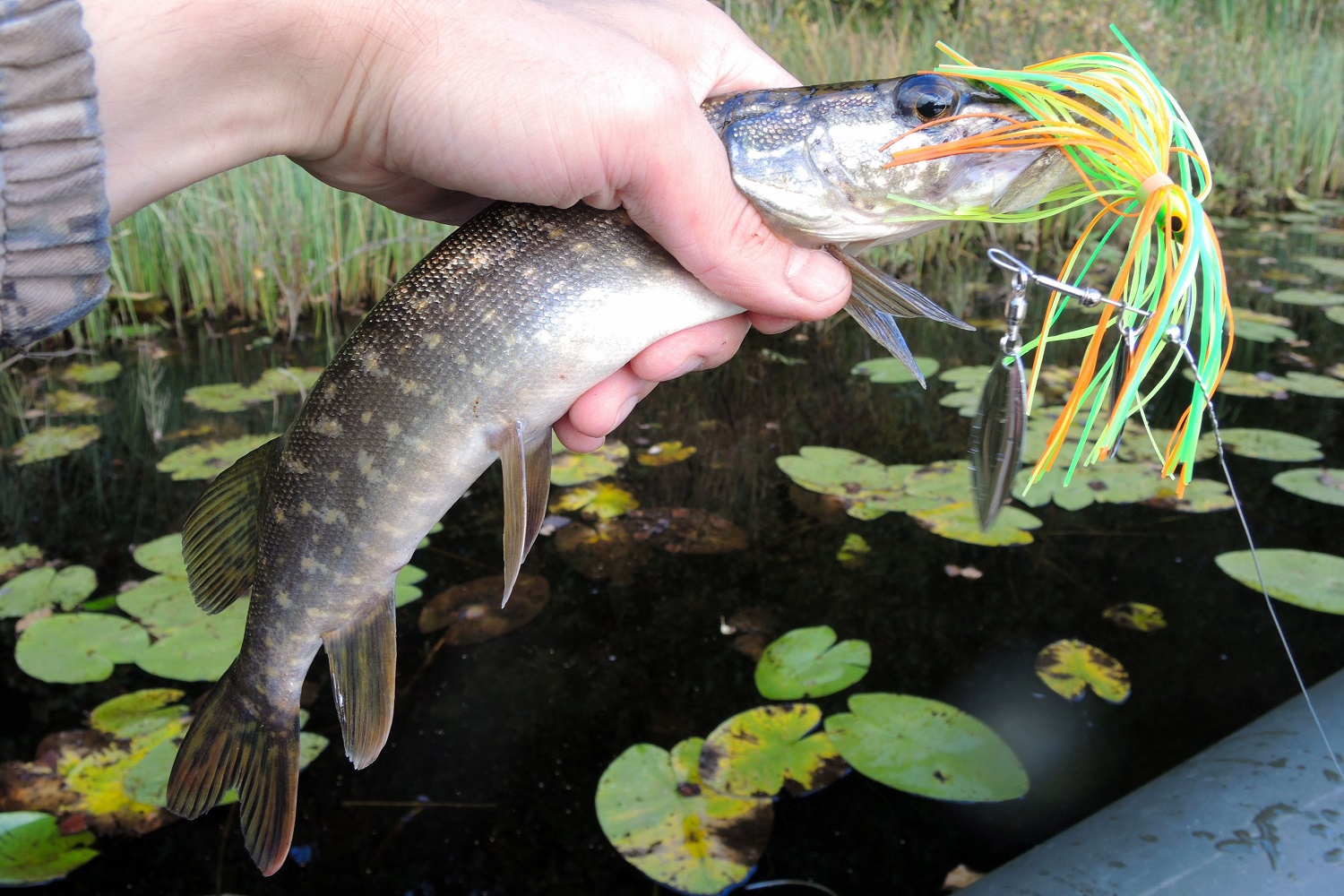 В траве чаще попадается не самая крупная щука, и в комментариях к обзорам на подобные приманки часто встречаются ехидные вопросы: «Зачем вы такую мелочь ловите?!» Отвечу сразу, что целенаправленно на мелочь мы не охотимся. Смысл в том, чтобы суметь поймать там, где другие и ловить не рискнут. А поскольку StrikePro SB-010 оснащен одинарным крючком, то проблем с тем, чтобы успешно отпустить попавшуюся рыбу, как правило не возникает. Да и щука покрупнее в такие места нередко наведывается.