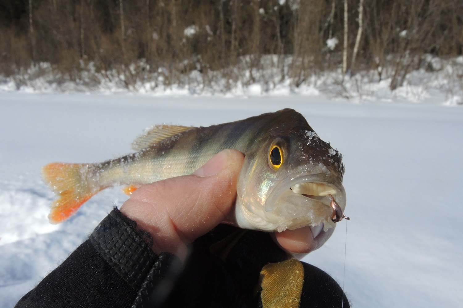 И это, кстати, очень правильно с точки зрения зимней ловли. На белом снегу желтая крышка хорошо выделяется, так что, если вы ее случайно выроните, то найти потеряшку будет проще.