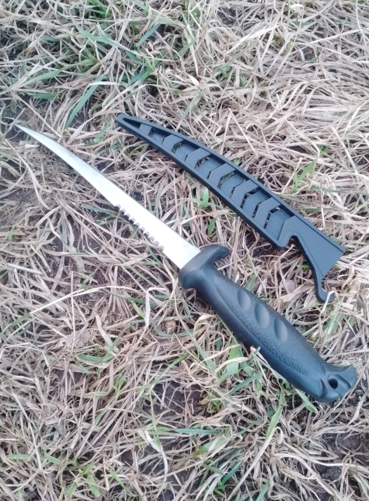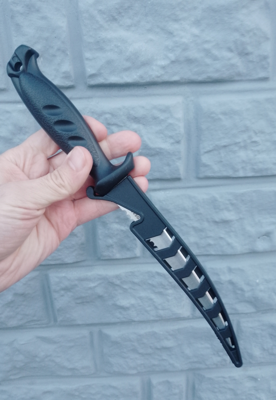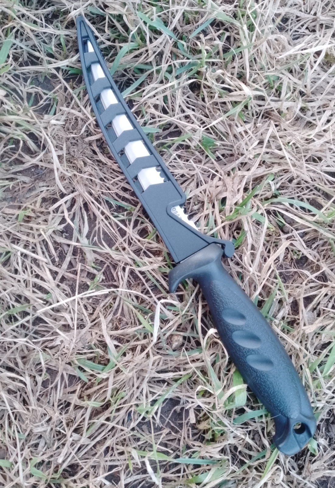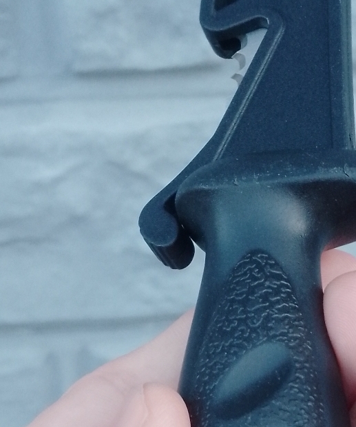 Для большей безопасности в процессе эксплуатации нож имеет ножны, тоже, логично, что пластиковые.