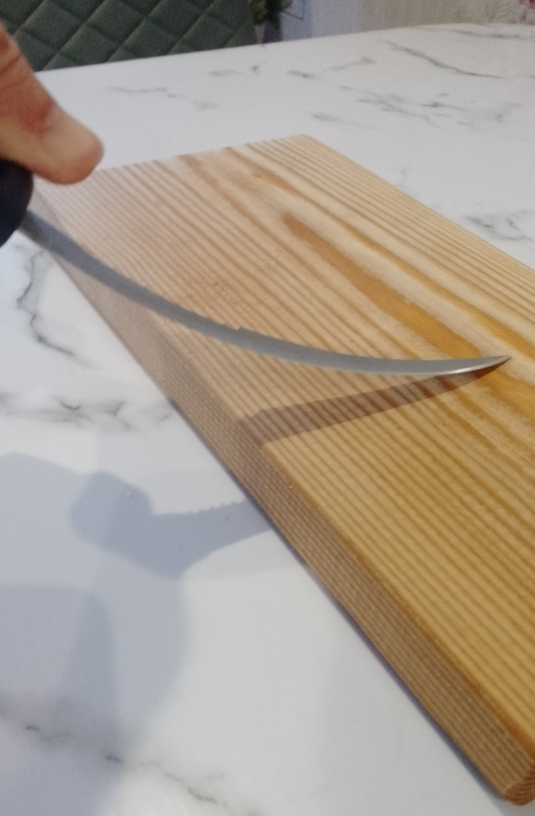 Лезвие ножа в меру жесткое, изгибается при филировании достаточно неплохо, полностью приходит в своё исходное состояние после окончания работы с ним...