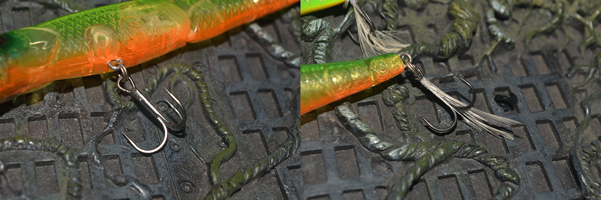Воблер шумящий, у него по шумовой камере в каждом из сегментов тела, шарики в них некрупные, тон средне-высокий, громкость средняя. Тройники разного размера, спереди более крупный, задний тройник с небольшой аккуратной опушкой, считаю, по окуню это важно. Тройники серые, марки Gamakatsu, жала тонковатые, но упругие, «на грани», но всё же вполне достаточные.