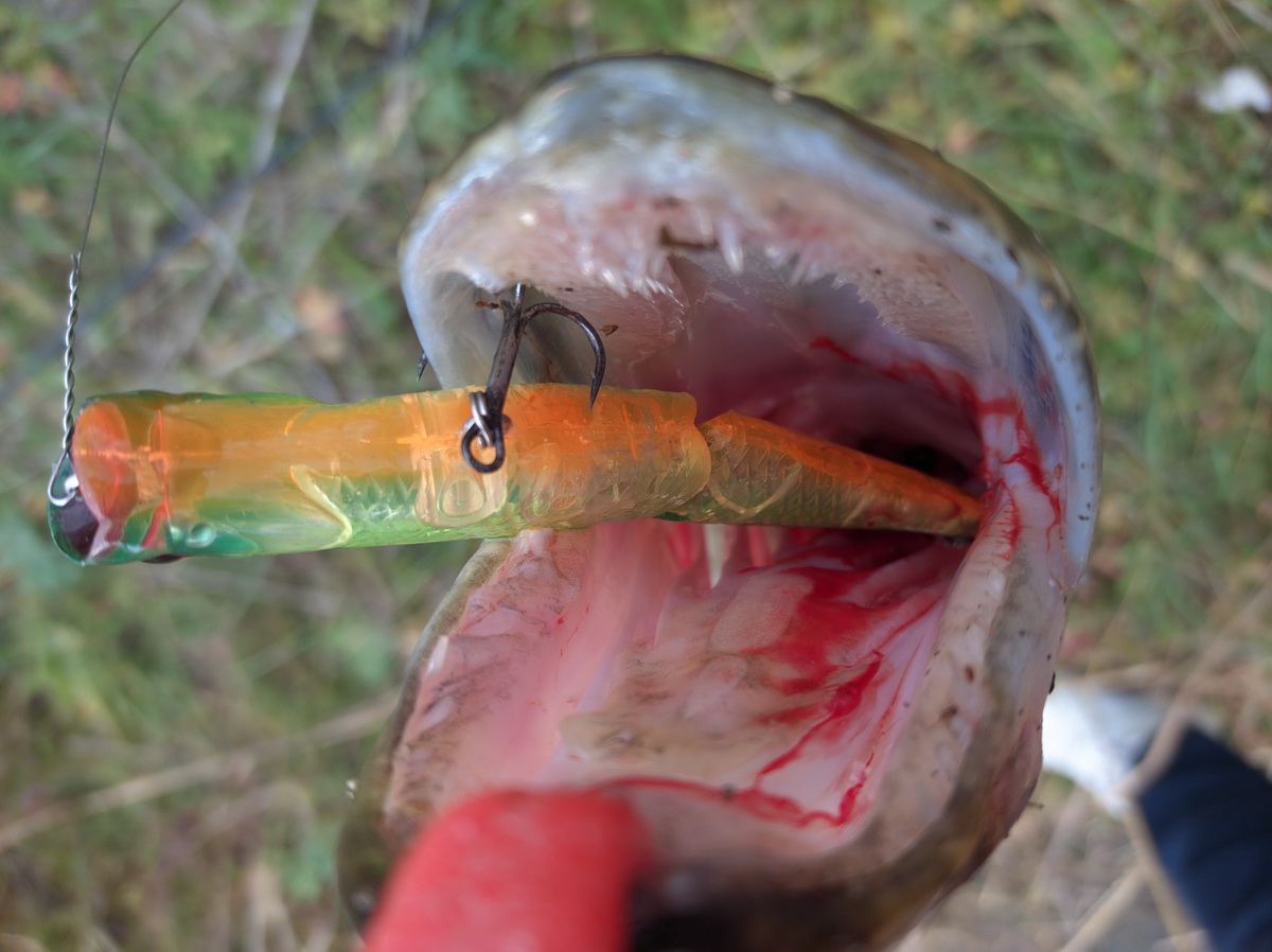 Есть одна «проблема» у героя обзора, типичная для поверхностных приманок: щука часто глотает поппер в заглот, и задний тройник оказывается на жабрах. А Бойл Триггер еще и составник в длине 100, то есть может оказаться еще глубже, чем обычно, и достать его из пасти порой непросто, особенно, без вреда для щуки. И сделать с этим ничего нельзя: такие атаки происходят потому что щука, как правило, догоняет поппер сзади, просто открывает рот, и вот он, уже весь внутри.