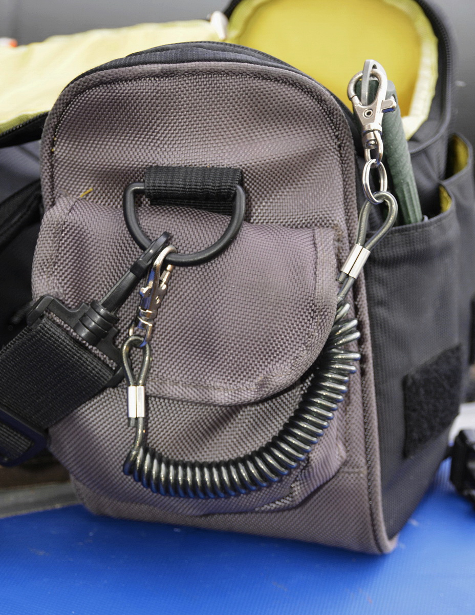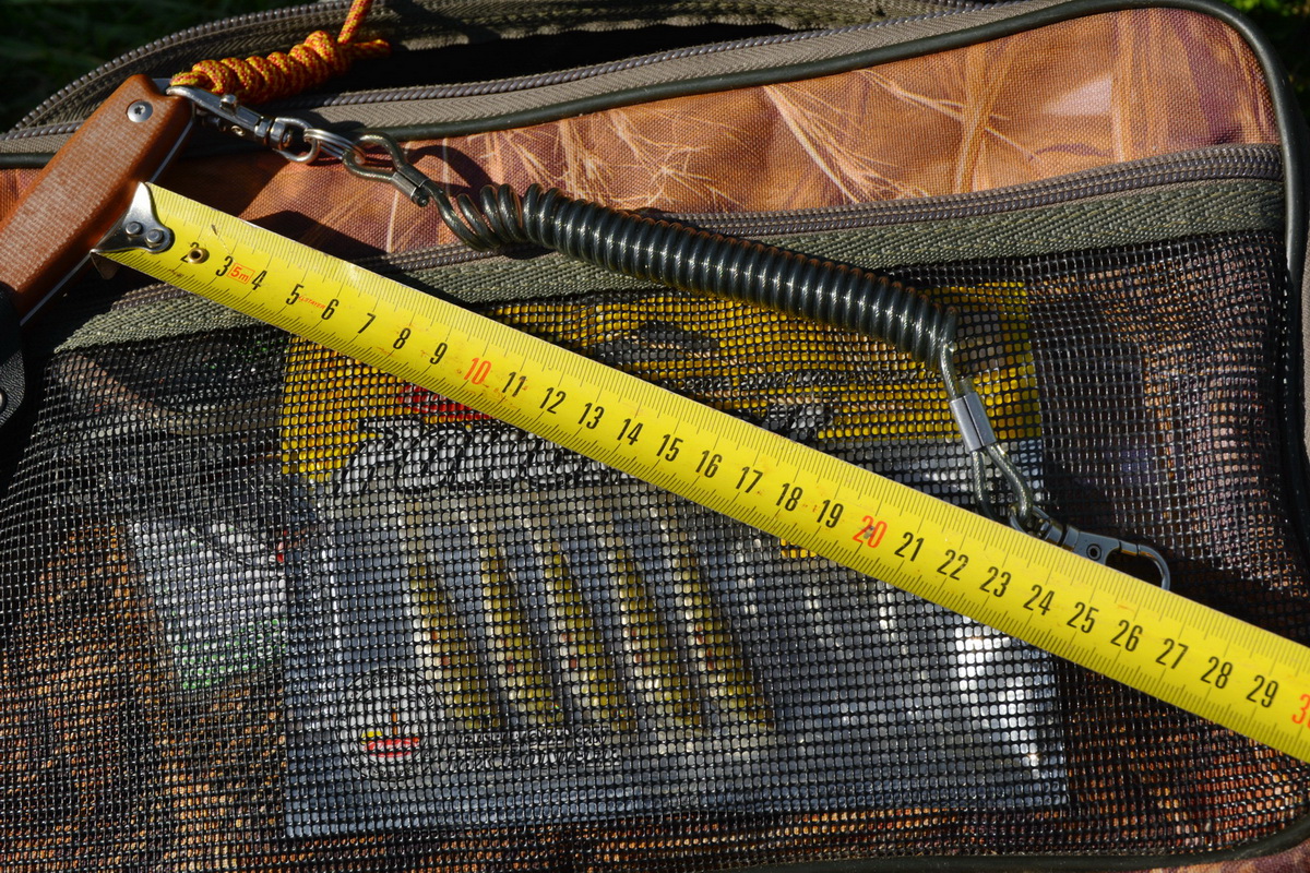 Один карабин монтирую в темлячное отверстие, второй цепляю за обвес сумки или рюкзака, ножны с креплением тек лок на плечевой ремень. Тем самым полностью исключается потеря этого необходимого, в том числе и на рыбалке элемента экипировки. Нож без проблем естественно можно заменить на любой другой инструмент.