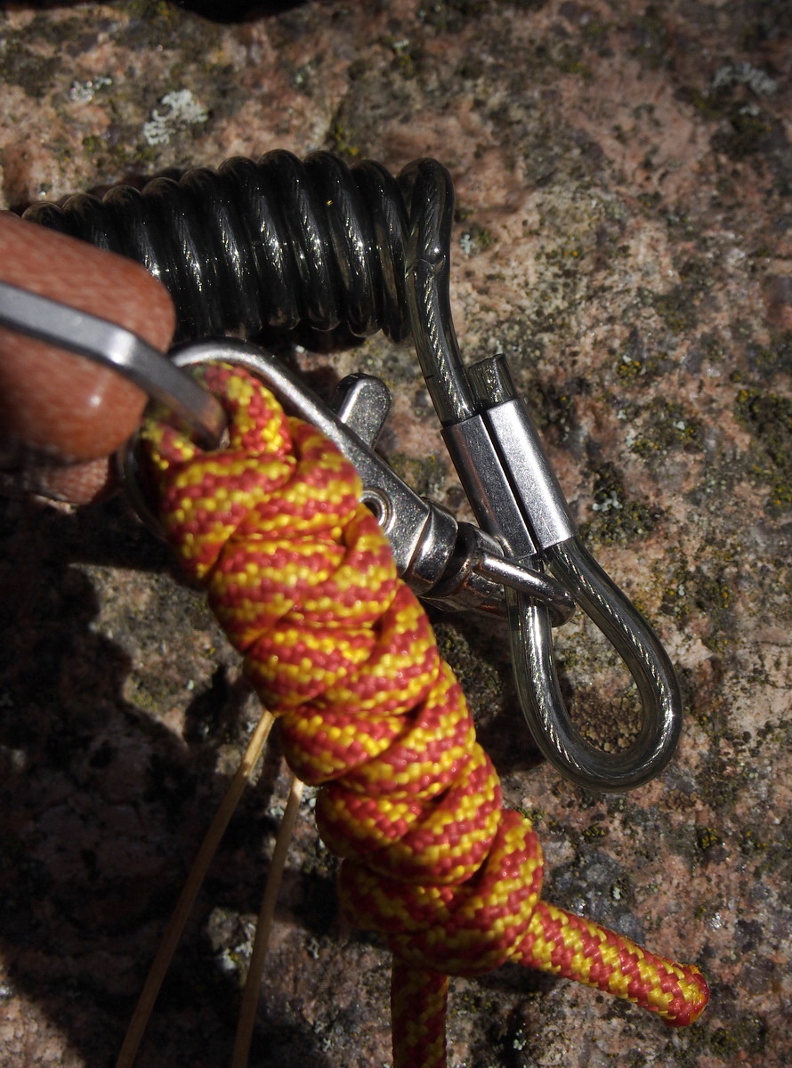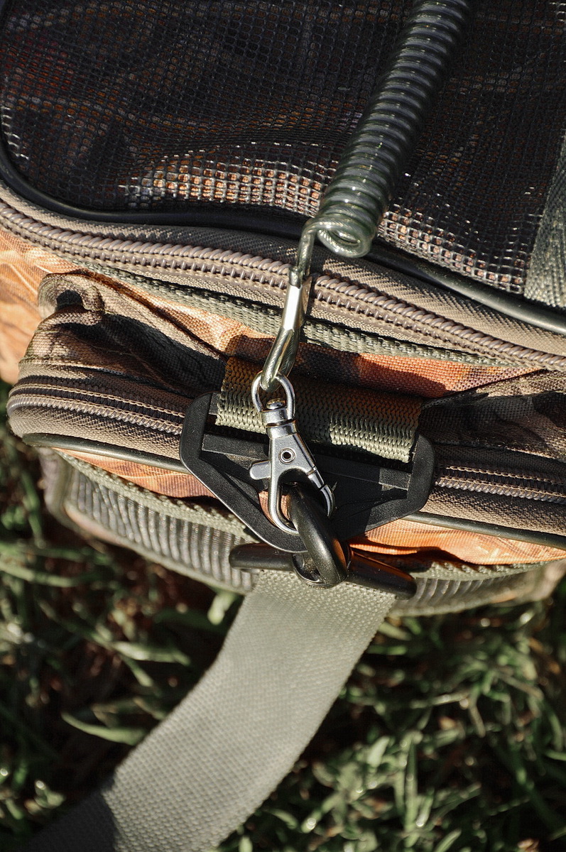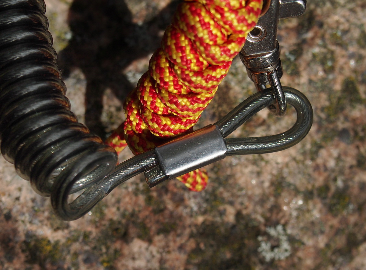 На каждой из двух петель, с одной стороны на прямую, с другой по средствам средних размеров заводного кольца смонтировано по мощному металлическому, вращающемуся наподобие вертлюжка карабину, имеющего подпружиненную конструкцию. Ещё из особенностей устройства этого элемента отдельно хотелось бы отметить компактные размеры, удобный «ухватистый» плавник, довольно тугую и надёжно запирающую механизм пружину. А также толстые стенки трубчатой втулки, на которой и вращается запирающий механизм.