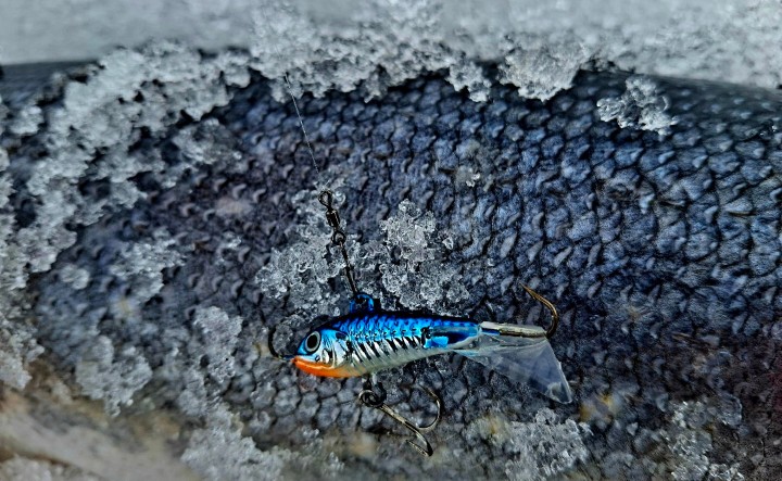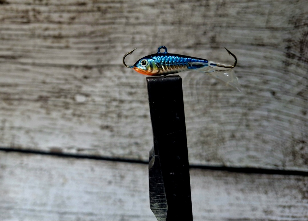 Каких-то прям ярких элементов балансир не имеет. Пузо бело-серое, а основной оттенок тела голубоватый. Не просто голубоватый, а с применением глянца. Балансир переливается и блестит, как малёк уклейки.